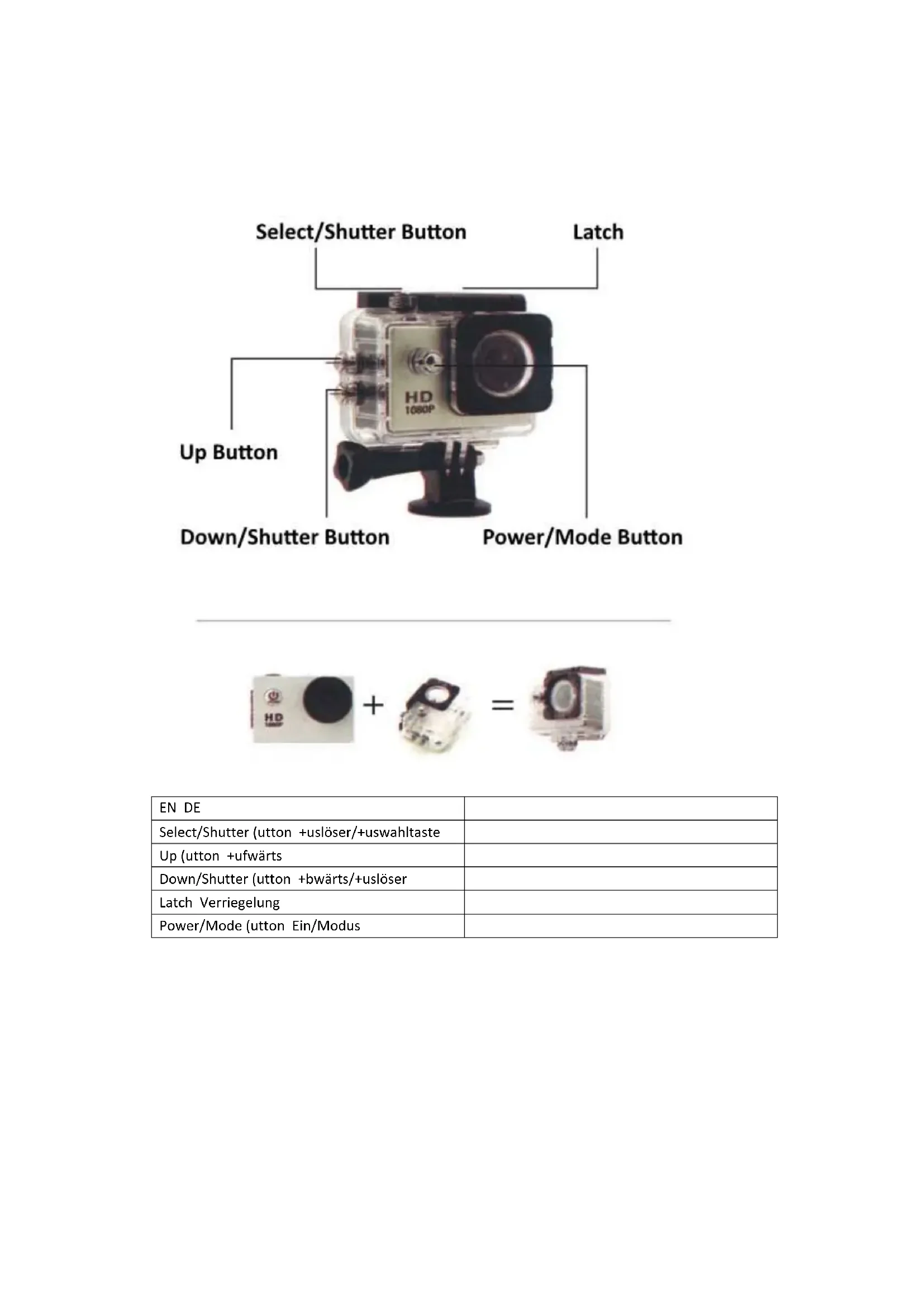 Paxi FUNBedienelemente und Funktionen EN DE Shutter/Select Button Auslöser/Auswahltaste Status Light Status-LED Power/Mode Button Ein/Modus MicroSD Slot microSD-Steckplatz Microphone Mikrofon Micro USB Port Mikro-USB-Port Lens Objektiv Status Indicator Light Status-LED Screen Display Up Button Aufwärts Speaker Lautsprecher Down/Shutter Button Abwärts/AuslöserEN DE Battery Door Latch Batteriefachverriegelung Battery Door BatteriefachEN DE Select/Shutter Button Auslöser/Auswahltaste Up Button Aufwärts Down/Shutter Button Abwärts/Auslöser Latch Verriegelung Power/Mode Button Ein/ModusZUBEHÖR Wasserfestes Gehäuse Lenker-/Stangenhalterung