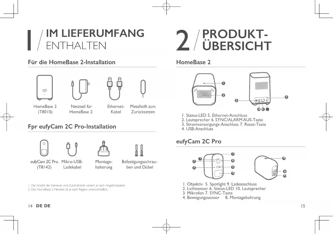 IM LIEFERUMFANG ENTHALTEN Für die HomeBase 2-Installation HomeBase 2 (T8010) Netzteil für HomeBase 2 Ethernet- Kabel Metallstift zum Zurücksetzen Fpr eufyCam 2C Pro-Installation eufyCam 2C Pro. (T8142) Mikro-USB- Ladekabel Montage- halterung Befestigungsschrau- ben und Dübel 1. Die Anzahl der Kameras und Zubehörteile variiert je nach Angebotspaket. 2. Das HomeBase 2-Netzteil ist je nach Region unterschiedlich.. PRODUKT- ÜBERSICHT HomeBase 2