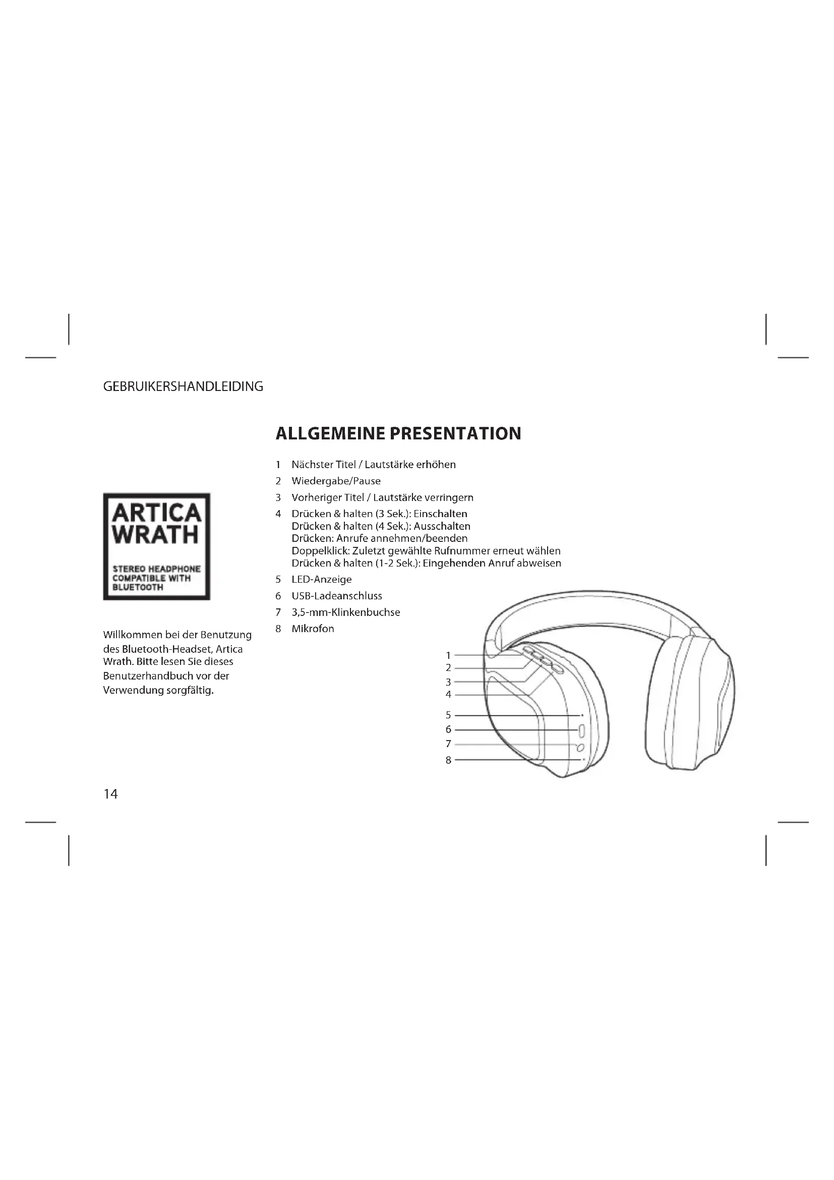 Willkommen bei der Benutzung des Bluetooth-Headset, Artica Wrath. Bitte lesen Sie dieses Benutzerhandbuch vor der Verwendung sorgfältig. ALLGEMEINE PRESENTATION Nächster Titel / Lautstärke erhöhen Wiedergabe/Pause Vorheriger Titel / Lautstärke verringern Drücken & halten (3 Sek.): Einschalten Drücken & halten (4 Sek.): Ausschalten Drücken: Anrufe annehmen/beenden Doppelklick: Zuletzt gewählte Rufnummer erneut wählen Drücken & halten (1-2 Sek.): Eingehenden Anruf abweisen LED-Anzeige USB-Ladeanschluss 3,5-mm-Klinkenbuchse Mikrofon