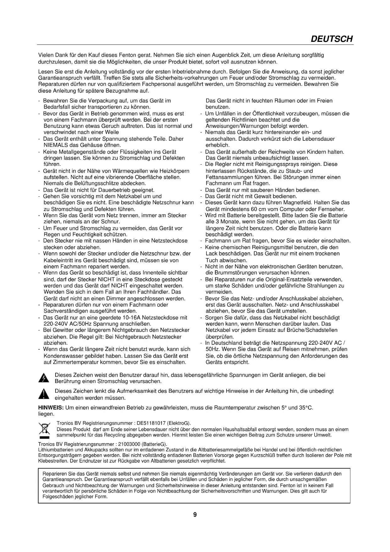 De microfoon is niet goed aangesloten Controleer microfoon volume regelaar Vervang de microfoon RONDZINGEN De microfoon wordt te dicht bij de speakers gehouden Master-Volume (8) regelaar staat teveel open9 DEUTSCH Vielen Dank für den Kauf dieses Fenton gerat. Nehmen Sie sich einen Augenblick Zeit, um diese Anleitung sorgfältig durchzulesen, damit sie die Möglichkeiten, die unser Produkt bietet, sofort voll ausnutzen können. Lesen Sie erst die Anleitung vollständig vor der ersten Inbetriebnahme durch. Befolgen Sie die Anweisung, da sonst jeglicher Garantieanspruch verfällt. Treffen Sie stets alle Sicherheits-vorkehrungen um Feuer und/oder Stromschlag zu vermeiden. Reparaturen dürfen nur von qualifiziertem Fachpersonal ausgeführt werden, um Stromschlag zu vermeiden. Bewahren Sie diese Anleitung für spätere Bezugnahme auf. - Bewahren Sie die Verpackung auf, um das Gerät im Bedarfsfall sicher transportieren zu können. - Bevor das Gerät in Betrieb genommen wird, muss es erst von einem Fachmann überprüft werden. Bei der ersten Benutzung kann etwas Geruch auftreten. Das ist normal und verschwindet nach einer Weile - Das Gerät enthält unter Spannung stehende Teile. Daher NIEMALS das Gehäuse öffnen. - Keine Metallgegenstände oder Flüssigkeiten ins Gerät dringen lassen. Sie können zu Stromschlag und Defekten führen. - Gerät nicht in der Nähe von Wärmequellen wie Heizkörpern aufstellen. Nicht auf eine vibrierende Oberfläche stellen. Niemals die Belüftungsschlitze abdecken. - Das Gerät ist nicht für Dauerbetrieb geeignet. - Gehen Sie vorsichtig mit dem Netzkabel um und beschädigen Sie es nicht. Eine beschädigte Netzschnur kann zu Stromschlag und Defekten führen. - Wenn Sie das Gerät vom Netz trennen, immer am Stecker ziehen, niemals an der Schnur. - Um Feuer und Stromschlag zu vermeiden, das Gerät vor Regen und Feuchtigkeit schützen. - Den Stecker nie mit nassen Händen in eine Netzsteckdose stecken oder abziehen. - Wenn sowohl der Stecker und/oder die Netzschnur bzw. der Kabeleintritt ins Gerät beschädigt sind, müssen sie von einem Fachmann repariert werden. - Wenn das Gerät so beschädigt ist, dass Innenteile sichtbar sind, darf der Stecker NICHT in eine Steckdose gesteckt werden und das Gerät darf NICHT eingeschaltet werden. Wenden Sie sich in dem Fall an Ihren Fachhändler. Das Gerät darf nicht an einen Dimmer angeschlossen werden. - Reparaturen dürfen nur von einem Fachmann oder Sachverständigen ausgeführt werden. - Das Gerät nur an eine geerdete 10-16A Netzsteckdose mit 220-240V AC/50Hz Spannung anschließen. - Bei Gewitter oder längerem Nichtgebrauch den Netzstecker abziehen. Die Regel gilt: Bei Nichtgebrauch Netzstecker abziehen. - Wenn das Gerät längere Zeit nicht benutzt wurde, kann sich Kondenswasser gebildet haben. Lassen Sie das Gerät erst auf Zimmertemperatur kommen, bevor Sie es einschalten. Das Gerät nicht in feuchten Räumen oder im Freien benutzen. - Um Unfällen in der Öffentlichkeit vorzubeugen, müssen die geltenden Richtlinien beachtet und die Anweisungen/Warnungen befolgt werden. - Niemals das Gerät kurz hintereinander ein- und ausschalten. Dadurch verkürzt sich die Lebensdauer erheblich. - Das Gerät außerhalb der Reichweite von Kindern halten. Das Gerät niemals unbeaufsichtigt lassen. - Die Regler nicht mit Reinigungssprays reinigen. Diese hinterlassen Rückstände, die zu Staub- und Fettansammlungen führen. Bei Störungen immer einen Fachmann um Rat fragen. - Das Gerät nur mit sauberen Händen bedienen. - Das Gerät nicht mit Gewalt bedienen. - Dieses Gerät kann dazu führen Magnetfeld. Halten Sie das Gerät mindestens 60 cm vom Computer oder Fernseher. - Wird mit Batterie bereitgestellt. Bitte laden Sie die Batterie alle 3 Monate, wenn Sie nicht gehen, um das Gerät für längere Zeit nicht benutzen. Oder die Batterie kann beschädigt werden. - Fachmann um Rat fragen, bevor Sie es wieder einschalten. - Keine chemischen Reinigungsmittel benutzen, die den Lack beschädigen. Das Gerät nur mit einem trockenen Tuch abwischen. - Nicht in der Nähe von elektronischen Geräten benutzen, die Brummstörungen verursachen können. - Bei Reparaturen nur die Original-Ersatzteile verwenden, um starke Schäden und/oder gefährliche Strahlungen zu vermeiden. - Bevor Sie das Netz- und/oder Anschlusskabel abziehen, erst das Gerät ausschalten. Netz- und Anschlusskabel abziehen, bevor Sie das Gerät umstellen. - Sorgen Sie dafür, dass das Netzkabel nicht beschädigt werden kann, wenn Menschen darüber laufen. Das Netzkabel vor jedem Einsatz auf Brüche/Schadstellen überprüfen. - In Deutschland beträgt die Netzspannung 220-240V AC / 50Hz. Wenn Sie das Gerät auf Reisen mitnehmen, prüfen Sie, ob die örtliche Netzspannung den Anforderungen des Geräts entspricht. Dieses Zeichen weist den Benutzer darauf hin, dass lebensgefährliche Spannungen im Gerät anliegen, die bei Berührung einen Stromschlag verursachen. Dieses Zeichen lenkt die Aufmerksamkeit des Benutzers auf wichtige Hinweise in der Anleitung hin, die unbedingt eingehalten werden müssen. HINWEIS: Um einen einwandfreien Betrieb zu gewährleisten, muss die Raumtemperatur zwischen 5° und 35°C. liegen. Tronios BV Registrierungsnummer : DE51181017 (ElektroG). Dieses Produkt darf am Ende seiner Lebensdauer nicht über den normalen Haushaltsabfall entsorgt werden, sondern muss an einem sammelpunkt für das Recycling abgegeben werden. Hiermit leisten Sie einen wichtigen Beitrag zum Schutze unserer Umwelt. Tronios BV Registrierungsnummer : 21003000 (BatterieG). Lithiumbatterien und Akkupacks sollten nur im entladenen Zustand in die Altbatteriesammelgefäße bei Handel und bei öffentlich-rechtlichen Entsorgungsträgern gegeben werden. Bei nicht vollständig entladenen Batterien Vorsorge gegen Kurzschlüß treffen durch Isolieren der Pole mit Klebestreifen. Der Endnutzer ist zur Rückgabe von Altbatterien gesetzlich verpflichtet.