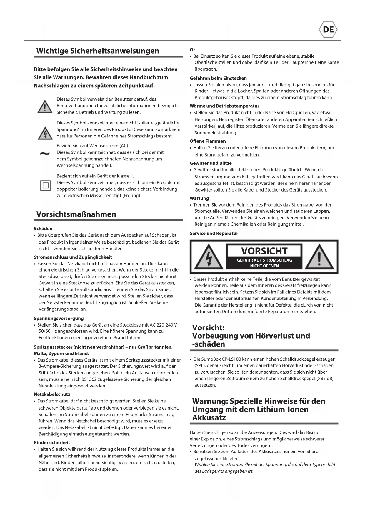 - Die SumoBox CP-LS100 kann einen hohen Schalldruckpegel erzeugen (SPL), der ausreicht, um einen dauerhaften Hörverlust oder -schaden zu verursachen. Sie sollten darauf achten, dass Sie sich nicht über einen längeren Zeitraum einem zu hohen Schalldruckpegel (>85dB) aussetzen. Warnung: Spezielle Hinweise für den Umgang mit dem Lithium-Ionen- Akkusatz Halten Sie sich genau an die Anweisungen. Dies wird das Risiko einer Explosion, eines Stromschlags und möglicherweise schwerer Verletzungen oder des Todes verringern.• Benutzen Sie zum Auaden des Akkusatzes nur ein von Sharp zugelassenes Netzteil.Wählen Sie eine Stromquelle mit der Spannung, die auf dem Typenschild des Ladegeräts angegeben ist. CAUTION