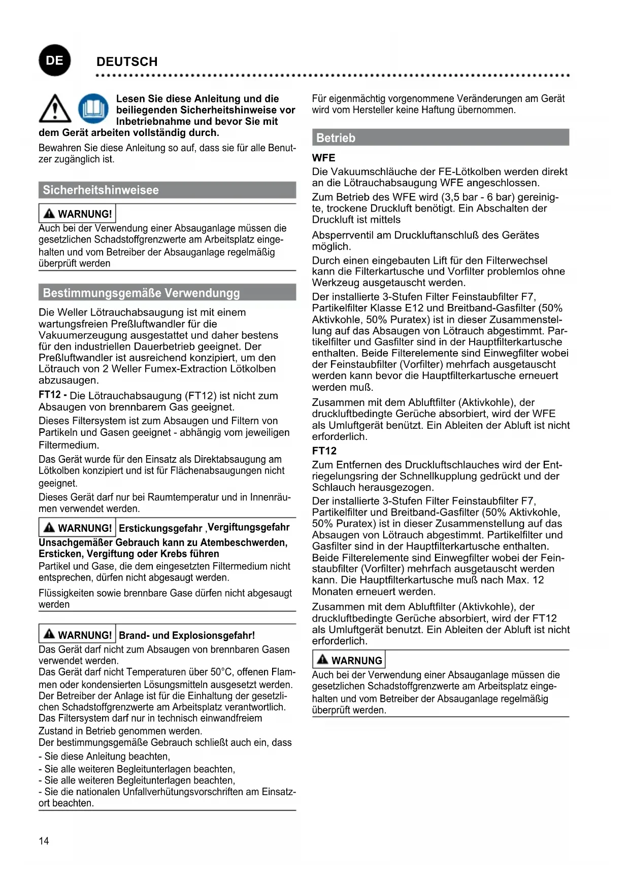 Lesen Sie diese Anleitung und die beiliegenden Sicherheitshinweise vor Inbetriebnahme und bevor Sie mit dem Gerät arbeiten vollständig durch. Bewahren Sie diese Anleitung so auf, dass sie für alle Benut- zer zugänglich ist. Sicherheitshinweisee WARNUNG! Auch bei der Verwendung einer Absauganlage müssen die gesetzlichen Schadstoffgrenzwerte am Arbeitsplatz einge- halten und vom Betreiber der Absauganlage regelmäßig überprüft werden Bestimmungsgemäße Verwendungg Die Weller Lötrauchabsaugung ist mit einem wartungsfreien Preßluftwandler für die Vakuumerzeugung ausgestattet und daher bestens für den industriellen Dauerbetrieb geeignet. Der Preßluftwandler ist ausreichend konzipiert, um den Lötrauch von 2 Weller Fumex-Extraction Lötkolben abzusaugen. FT12 - Die Lötrauchabsaugung (FT12) ist nicht zum Absaugen von brennbarem Gas geeignet. Dieses Filtersystem ist zum Absaugen und Filtern von Partikeln und Gasen geeignet - abhängig vom jeweiligen Filtermedium. Das Gerät wurde für den Einsatz als Direktabsaugung am Lötkolben konzipiert und ist für Flächenabsaugungen nicht geeignet. Dieses Gerät darf nur bei Raumtemperatur und in Innenräu- men verwendet werden. WARNUNG! Erstickungsgefahr , Vergiftungsgefahr Unsachgemäßer Gebrauch kann zu Atembeschwerden, Ersticken, Vergiftung oder Krebs führen Partikel und Gase, die dem eingesetzten Filtermedium nicht entsprechen, dürfen nicht abgesaugt werden. Flüssigkeiten sowie brennbare Gase dürfen nicht abgesaugt werden WARNUNG! Brand- und Explosionsgefahr! Das Gerät darf nicht zum Absaugen von brennbaren Gasen verwendet werden. Das Gerät darf nicht Temperaturen über 50°C, offenen Flam- men oder kondensierten Lösungsmitteln ausgesetzt werden. Der Betreiber der Anlage ist für die Einhaltung der gesetzli- chen Schadstoffgrenzwerte am Arbeitsplatz verantwortlich. Das Filtersystem darf nur in technisch einwandfreiem Zustand in Betrieb genommen werden. Der bestimmungsgemäße Gebrauch schließt auch ein, dass - Sie diese Anleitung beachten, - Sie alle weiteren Begleitunterlagen beachten, - Sie alle weiteren Begleitunterlagen beachten, - Sie die nationalen Unfallverhütungsvorschriften am Einsatz- ort beachten. Für eigenmächtig vorgenommene Veränderungen am Gerät wird vom Hersteller keine Haftung übernommen. Betrieb WFE Die Vakuumschläuche der FE-Lötkolben werden direkt an die Lötrauchabsaugung WFE angeschlossen. Zum Betrieb des WFE wird (3,5 bar - 6 bar) gereinig- te, trockene Druckluft benötigt. Ein Abschalten der Druckluft ist mittels Absperrventil am Druckluftanschluß des Gerätes möglich. Durch einen eingebauten Lift für den Filterwechsel kann die Filterkartusche und Vorlter problemlos ohne Werkzeug ausgetauscht werden. Der installierte 3-Stufen Filter Feinstaublter F7, Partikellter Klasse E12 und Breitband-Gaslter (50% Aktivkohle, 50% Puratex) ist in dieser Zusammenstel- lung auf das Absaugen von Lötrauch abgestimmt. Par- tikellter und Gaslter sind in der Hauptlterkartusche enthalten. Beide Filterelemente sind Einweglter wobei der Feinstaublter (Vorlter) mehrfach ausgetauscht werden kann bevor die Hauptlterkartusche erneuert werden muß. Zusammen mit dem Abluftlter (Aktivkohle), der druckluftbedingte Gerüche absorbiert, wird der WFE als Umluftgerät benützt. Ein Ableiten der Abluft ist nicht erforderlich. FT12 Zum Entfernen des Druckluftschlauches wird der Ent- riegelungsring der Schnellkupplung gedrückt und der Schlauch herausgezogen. Der installierte 3-Stufen Filter Feinstaublter F7, Partikellter und Breitband-Gaslter (50% Aktivkohle, 50% Puratex) ist in dieser Zusammenstellung auf das Absaugen von Lötrauch abgestimmt. Partikellter und Gaslter sind in der Hauptlterkartusche enthalten. Beide Filterelemente sind Einweglter wobei der Fein- staublter (Vorlter) mehrfach ausgetauscht werden kann. Die Hauptlterkartusche muß nach Max. 12 Monaten erneuert werden. Zusammen mit dem Abluftlter (Aktivkohle), der druckluftbedingte Gerüche absorbiert, wird der FT12 als Umluftgerät benutzt. Ein Ableiten der Abluft ist nicht erforderlich. WARNUNG Auch bei der Verwendung einer Absauganlage müssen die gesetzlichen Schadstoffgrenzwerte am Arbeitsplatz einge- halten und vom Betreiber der Absauganlage regelmäßig überprüft werden.