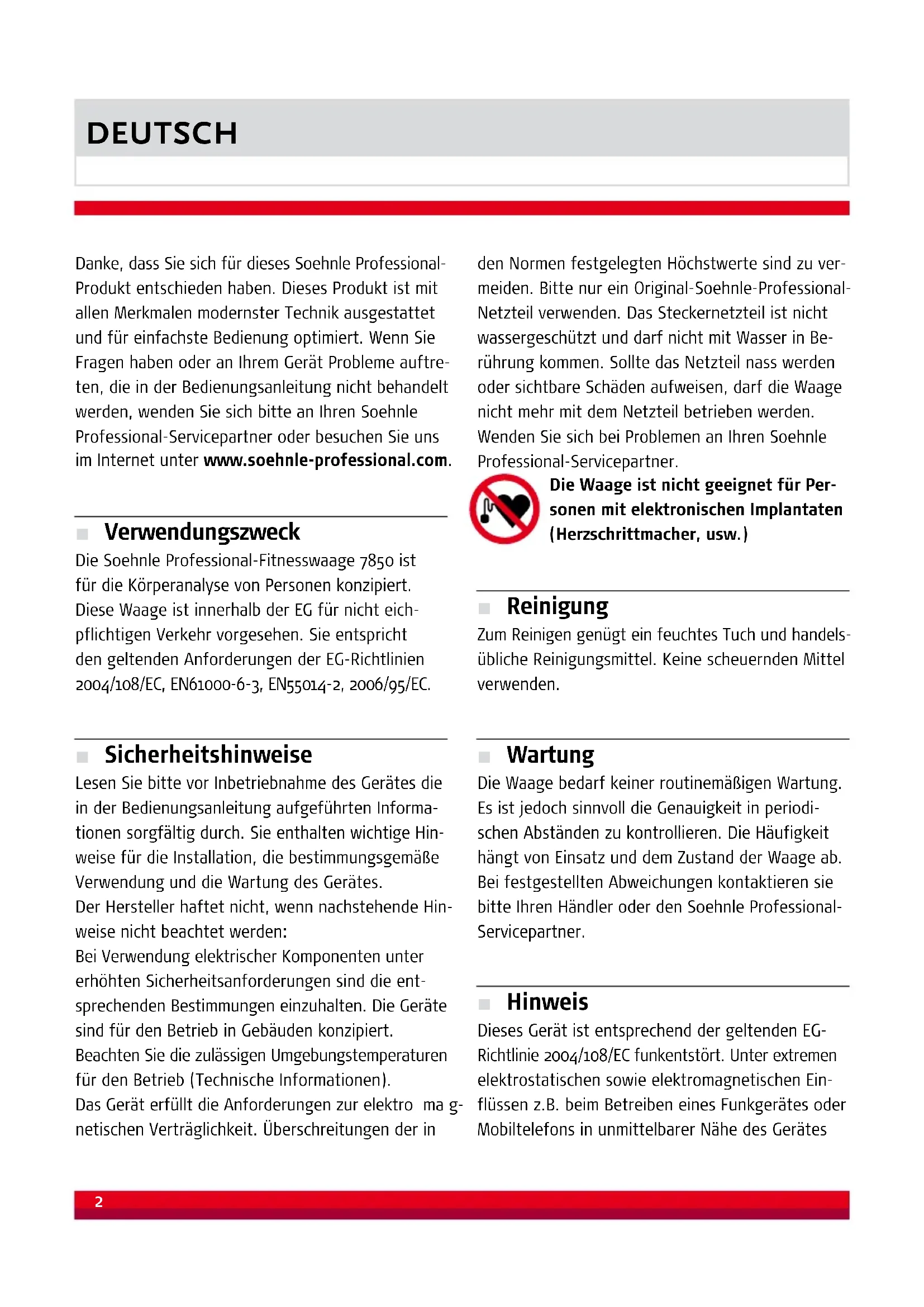 Danke, dass Sie sich für dieses Soehnle Professional- Produkt entschieden haben. Dieses Produkt ist mit allen Merkmalen modernster Technik ausgestattet und für einfachste Bedienung optimiert. Wenn Sie Fragen haben oder an Ihrem Gerät Probleme auftre- ten, die in der Bedienungsanleitung nicht behandelt werden, wenden Sie sich bitte an Ihren Soehnle Professional-Servicepartner oder besuchen Sie uns im Internet unter www.soehnle-professional.com. ■ Verwendungszweck Die Soehnle Professional-Fitnesswaage 7850 ist für die Körperanalyse von Personen konzipiert. Diese Waage ist innerhalb der EG für nicht eich- pflichtigen Verkehr vorgesehen. Sie entspricht den geltenden Anforderungen der EG-Richtlinien 2004/108/EC, EN61000-6-3, EN55014-2, 2006/95/EC. ■ Sicherheitshinweise Lesen Sie bitte vor Inbetriebnahme des Gerätes die in der Bedienungsanleitung aufgeführten Informa- tionen sorgfältig durch. Sie enthalten wichtige Hin- weise für die Installation, die bestimmungsgemäße Verwendung und die Wartung des Gerätes. Der Hersteller haftet nicht, wenn nachstehende Hin- weise nicht beachtet werden: Bei Verwendung elektrischer Komponenten unter erhöhten Sicherheitsanforderungen sind die ent- sprechenden Bestimmungen einzuhalten. Die Geräte sind für den Betrieb in Gebäuden konzipiert. Beachten Sie die zulässigen Umgebungstemperaturen für den Betrieb (Technische Informationen). Das Gerät erfüllt die Anforderungen zur elektro ma g- netischen Verträglichkeit. Überschreitungen der in den Normen festgelegten Höchstwerte sind zu ver- meiden. Bitte nur ein Original-Soehnle-Professional- Netzteil verwenden. Das Steckernetzteil ist nicht wassergeschützt und darf nicht mit Wasser in Be- rührung kommen. Sollte das Netzteil nass werden oder sichtbare Schäden aufweisen, darf die Waage nicht mehr mit dem Netzteil betrieben werden. Wenden Sie sich bei Problemen an Ihren Soehnle Professional-Servicepartner. Die Waage ist nicht geeignet für Per- sonen mit elektronischen Implantaten (Herzschrittmacher, usw.) ■ Reinigung Zum Reinigen genügt ein feuchtes Tuch und handels- übliche Reinigungsmittel. Keine scheuernden Mittel verwenden. ■ Wartung Die Waage bedarf keiner routinemäßigen Wartung. Es ist jedoch sinnvoll die Genauigkeit in periodi- schen Abständen zu kontrollieren. Die Häufigkeit hängt von Einsatz und dem Zustand der Waage ab. Bei festgestellten Abweichungen kontaktieren sie bitte Ihren Händler oder den Soehnle Professional- Servicepartner. ■ Hinweis Dieses Gerät ist entsprechend der geltenden EG- Richtlinie 2004/108/EC funkentstört. Unter extremen elektrostatischen sowie elektromagnetischen Ein- flüssen z.B. beim Betreiben eines Funkgerätes oder Mobiltelefons in unmittelbarer Nähe des GerätesDEUTSCH