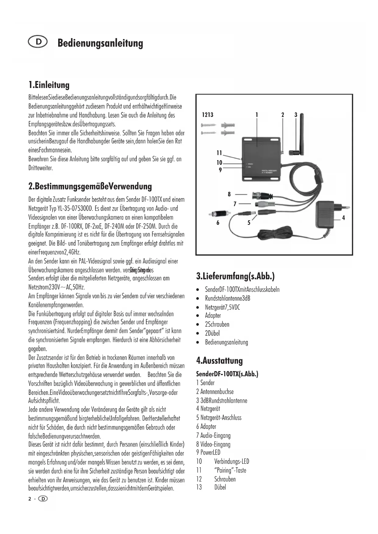 BittelesenSiedieseBedienungsanleitungvollständigundsorgfältigdurch.Die Bedienungsanleitunggehört zudiesem Produkt und enthältwichtigeHinweise zur Inbetriebnahme und Handhabung. Lesen Sie auch die Anleitung des Empfangsgerätesbzw.desÜbertragungssets. Beachten Sie immer alle Sicherheitshinweise. Sollten Sie Fragen haben oder unsicherinBezugauf die Handhabungder Geräte sein,dann holenSie den Rat einesFachmannesein. Bewahren Sie diese Anleitung bitte sorgfältig auf und geben Sie sie ggf. an Dritteweiter. Der digitale Zusatz Funksender bestehtaus dem Sender DF-100TX und einem Netzgerät Typ YL-35-075300D. Es dient zur Übertragung von Audio- und Videosignalen von einer Überwachungskamera an einen kompatibelem Empfänger z.B. DF-100RX, DF-2xxE, DF-240M oder DF-250M. Durch die digitale Komprimierung ist es nicht für die Übertragung von Fernsehsignalen geeignet. Die Bild- und Tonübertragung zum Empfänger erfolgt drahtlos mit einerFrequenzvon2,4GHz. An den Sender kann ein PAL-Videosignal sowie ggf. ein Audiosignal einer Überwachungskamera angeschlossen werden. versorgung des Senders erfolgt über die mitgelieferten Netzgeräte, angeschlossen am Netzstrom230V~AC,50Hz. Am Empfänger können Signale von bis zu vierSendern auf vier verschiedenen Kanälenempfangenwerden. Die Funkübertragung erfolgt auf digitaler Basis auf immer wechselnden Frequenzen (Frequenzhopping) die zwischen Sender und Empfänger synchronisiertsind. NurderEmpfänger dermit dem Sender“gepaart” ist kann die synchronisierten Signale empfangen. Hierdurch ist eine Abhörsicherheit gegeben. Beachten Sie die Vorschriften bezüglich Videoüberwachung in gewerblichen und öffentlichen Bereichen.EineVideoüberwachungersetztnichtIhreSorgfalts-,Vorsorge-oder Aufsichtspflicht. Jede andere Verwendung oder Veränderung der Geräte gilt als nicht bestimmungsgemäßund birgterheblicheUnfallgefahren. DerHerstellerhaftet nicht für Schäden, die durch nicht bestimmungsgemäßen Gebrauch oder falscheBedienungverursachtwerden. Die Strom Der Zusatzsender ist für den Betrieb in trockenen Räumen innerhalb von privaten Haushalten konzipiert. Für die Anwendung im Außenbereich müssen entsprechende Wetterschutzgehäuse verwendet werden. Dieses Gerät ist nicht dafür bestimmt, durch Personen (einschließlich Kinder) mit eingeschränkten physischen,sensorischen oder geistigenFähigkeiten oder mangels Erfahrung und/oder mangels Wissen benutzt zu werden, es sei denn, sie werden durch eine für ihre Sicherheit zuständige Person beaufsichtigt oder erhielten von ihr Anweisungen, wie das Gerät zu benutzen ist. Kinder müssen beaufsichtigtwerden,umsicherzustellen,dasssienichtmitdemGerätspielen.