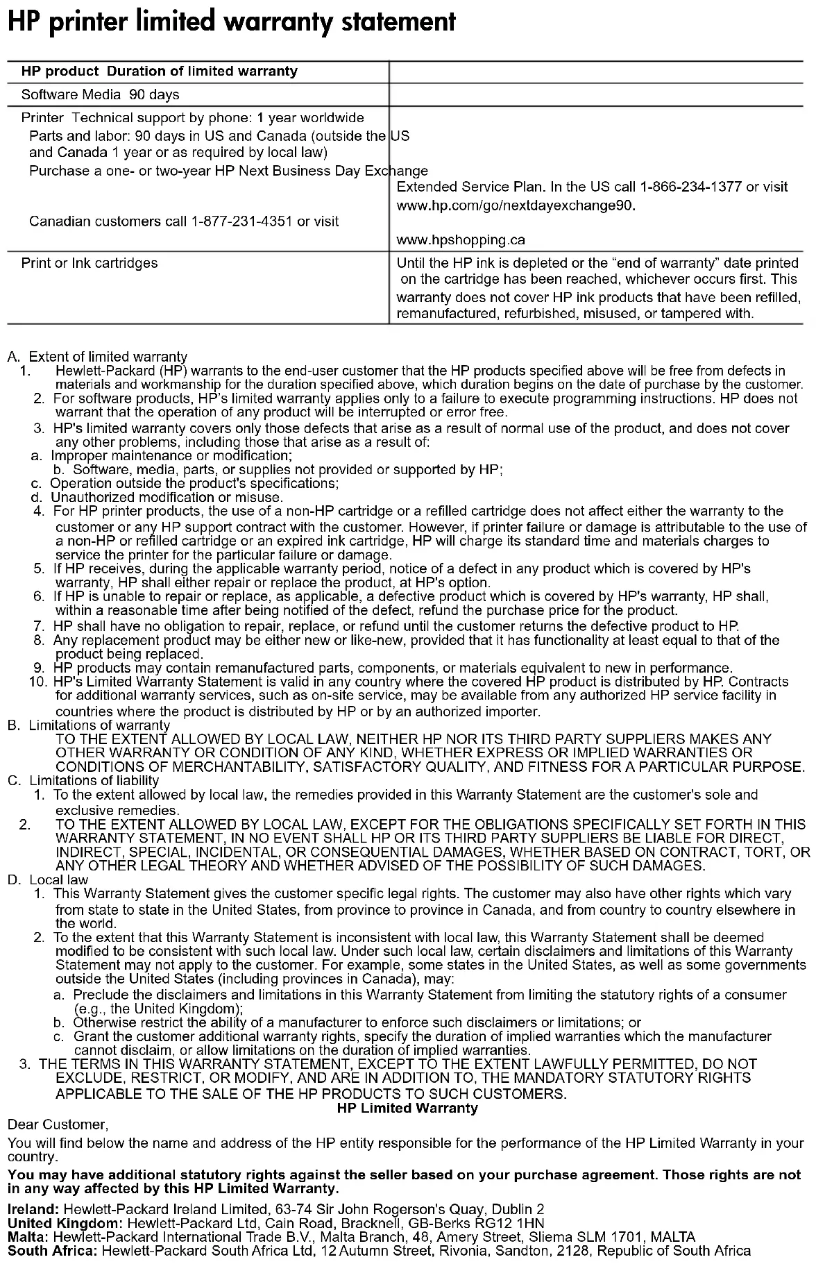 DAS IN DIESEN LÄNDERN GELTENDE RECHT IM ZUSAMMENHANG MIT DEM KAUF VON HP PRODUKTEN GEWÄHRT WERDEN, NUR IM GESETZLICH ZULÄSSIGEN RAHMEN AUSGESCHLOSSEN, EINGESCHRÄNKT ODER GEÄNDERT. DIE BEDINGUNGEN DIESER GEWÄHRLEISTUNGSVEREINBARUNG GELTEN ZUSÄTZLICH ZU DEN GESETZLICHEN ENDKUNDENRECHTEN. HP Herstellergarantie Sehr geehrter Kunde, Als Anlage finden Sie die Namen und Adressen der jeweiligen HP Gesellschaft, die in Ihrem Land die HP Herstellergarantie gewährt. Über die Herstellergarantie hinaus haben Sie gegebenenfalls Mängelansprüche gegenüber Ihrem Verkäufer aus dem Kaufvertrag, die durch diese Herstellergarantie nicht eingeschränkt werden. Deutschland: Hewlett-Packard GmbH, Herrenberger Straße 140, D-71034 Böblingen Luxemburg: Vegacenter, 75, Parc d'Activités Capellen, L-8308 Capellen Österreich: Hewlett-Packard Ges.m.b.H., Wienerbergstrasse 41 A-1120 Wien HP Produkt Dauer der beschränkten Gewährleistung Softwaremedien 90 Tage Drucker Technischer Support per Telefon: 1 Jahr weltweit Teile und Arbeit: 90 Tage in den USA und Kanada (außerhalb der USA und Kanada 1 Jahr oder Zeitraum gemäß geltenden lokalen Gesetzen) Kaufen Sie einen ein- oder zweijährigen HP Extended Service Plan mit Austausch am nächsten Geschäftstag. Rufen Sie in den USA unter 1-866-234-1377 an, oder besuchen Sie die Website unter www.hp.com/go/nextdayexchange90. Kunden in Kanada rufen unter 1-877-231-4351 an oder besuchen die Website unter www.hpshopping.ca Druckpatronen Bis die HP Tinte verbraucht oder das auf der Druckpatrone angegebene Enddatum für die Garantie erreicht ist, je nachdem, welcher Fall zuerst eintritt. Diese Garantie gilt nicht für nachgefüllte, nachgearbeitete, recycelte, zweckentfremdete oder in anderer Weise manipulierte HP Tintenprodukte. Erklärung zur beschränkten Gewährleistung für HP DruckerCartuccia di stampa in neroCartuccia in tricromia