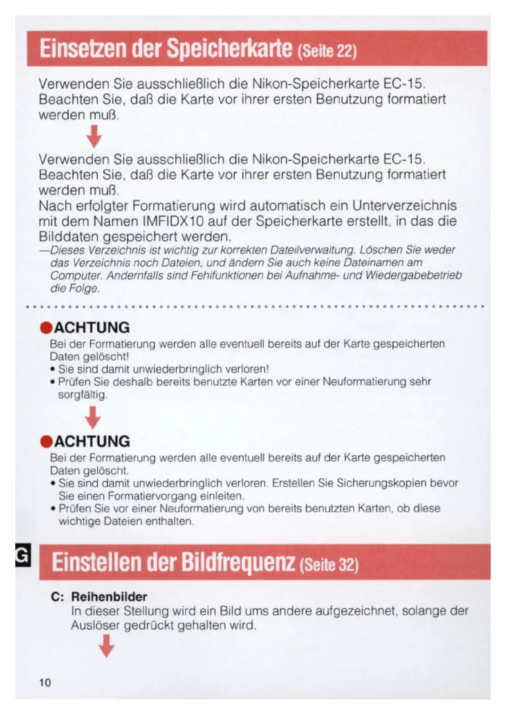 Verwenden Sie ausschlieBlich die Nikon-Speicherkarte EC-15. Beachten Sie, daB die Karte vor ihrer ersten Benutzung formatiert werden muB. Nach erfolgter Formatierung wird automatisch ein Unterverzeichnis mit dem Namen IMFIDX