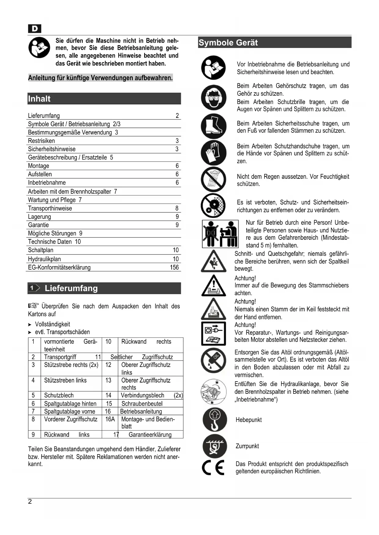 Inhalt Lieferumfang 2 Symbole Gerät / Betriebsanleitung 2/3 Bestimmungsgemäße Verwendung 3 Restrisiken 3 Sicherheitshinweise 3 Gerätebeschreibung / Ersatzteile 5 Montage 6 Aufstellen 6 Inbetriebnahme 6 Arbeiten mit dem Brennholzspalter 7 Wartung und Pflege 7 Transporthinweise 8 Lagerung 9 Garantie 9 Mögliche Störungen 9 Technische Daten 10 Schaltplan 10 Hydraulikplan 10 EG-Konformitätserklärung 156