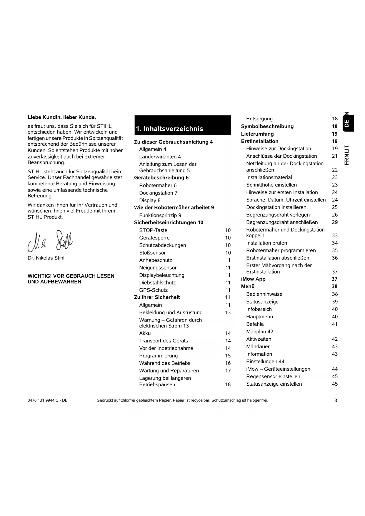 FRNLIT 0478 131 9944 C - DE Liebe Kundin, lieber Kunde, es freut uns, dass Sie sich für STIHL entschieden haben. Wir entwickeln und fertigen unsere Produkte in Spitzenqualität entsprechend der Bedürfnisse unserer Kunden. So entstehen Produkte mit hoher Zuverlässigkeit auch bei extremer Beanspruchung. STIHL steht auch für Spitzenqualität beim Service. Unser Fachhandel gewährleistet kompetente Beratung und Einweisung sowie eine umfassende technische Betreuung. Wir danken Ihnen für Ihr Vertrauen und wünschen Ihnen viel Freude mit Ihrem STIHL Produkt. Dr. Nikolas Stihl