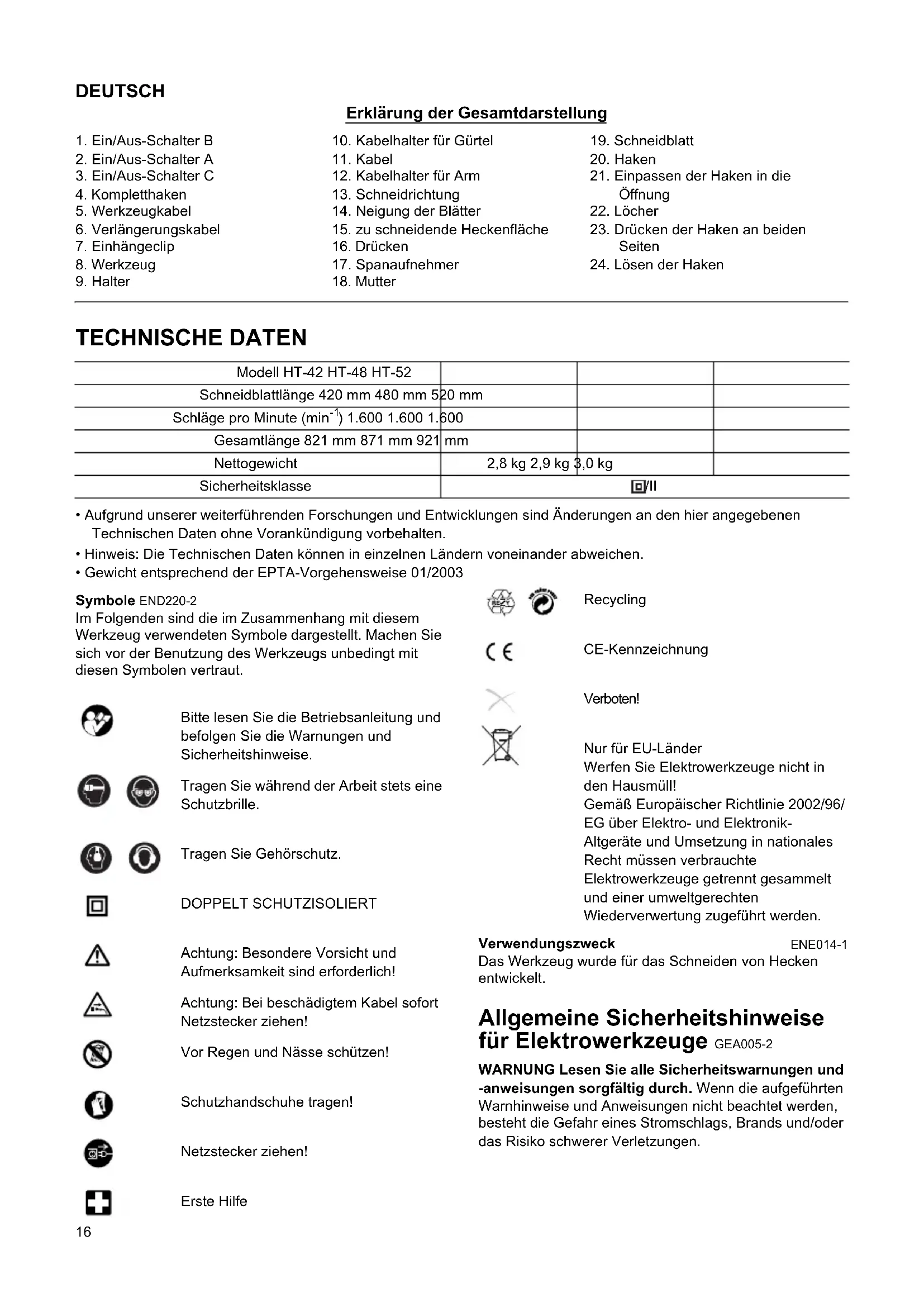 - Gewicht entsprechend der EPTA-Vorgehensweise 01/2003 Symbole END220-2 Im Folgenden sind die im Zusammenhang mit diesem Werkzeug verwendeten Symbole dargestellt. Machen Sie sich vor der Benutzung des Werkzeugs unbedingt mit diesen Symbolen vertraut. Bitte lesen Sie die Betriebsanleitung und befolgen Sie die Warnungen und Sicherheitshinweise. Tragen Sie während der Arbeit stets eine Schutzbrille. Tragen Sie Gehörschutz. DOPPELT SCHUTZISOLIERT Achtung: Besondere Vorsicht und Aufmerksamkeit sind erforderlich! Achtung: Bei beschädigtem Kabel sofort Netzstecker ziehen! Vor Regen und Nässe schützen! Schutzhandschuhe tragen! Netzstecker ziehen! Erste Hilfe Recycling CE-Kennzeichnung Verboten! Nur für EU-Länder Werfen Sie Elektrowerkzeuge nicht in den Hausmüll! Gemäß Europäischer Richtlinie 2002/96/ EG über Elektro- und Elektronik- Altgeräte und Umsetzung in nationales Recht müssen verbrauchte Elektrowerkzeuge getrennt gesammelt und einer umweltgerechten Wiederverwertung zugeführt werden. Verwendungszweck ENE014-1 Das Werkzeug wurde für das Schneiden von Hecken entwickelt. Allgemeine Sicherheitshinweise für Elektrowerkzeuge GEA005-2 WARNUNG Lesen Sie alle Sicherheitswarnungen und -anweisungen sorgfältig durch. Wenn die aufgeführten Warnhinweise und Anweisungen nicht beachtet werden, besteht die Gefahr eines Stromschlags, Brands und/oder das Risiko schwerer Verletzungen.