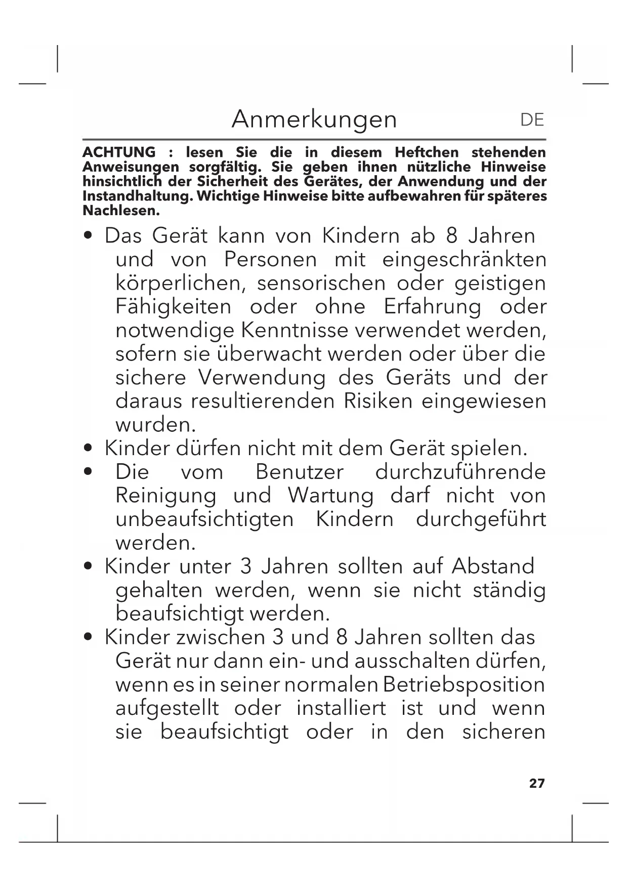 - Kinder zwischen 3 und 8 Jahren dürfen den Stecker nicht einstecken, das Gerät nicht einstellen oder reinigen, noch die Wartungsarbeiten durch den Benutzer durchführen.