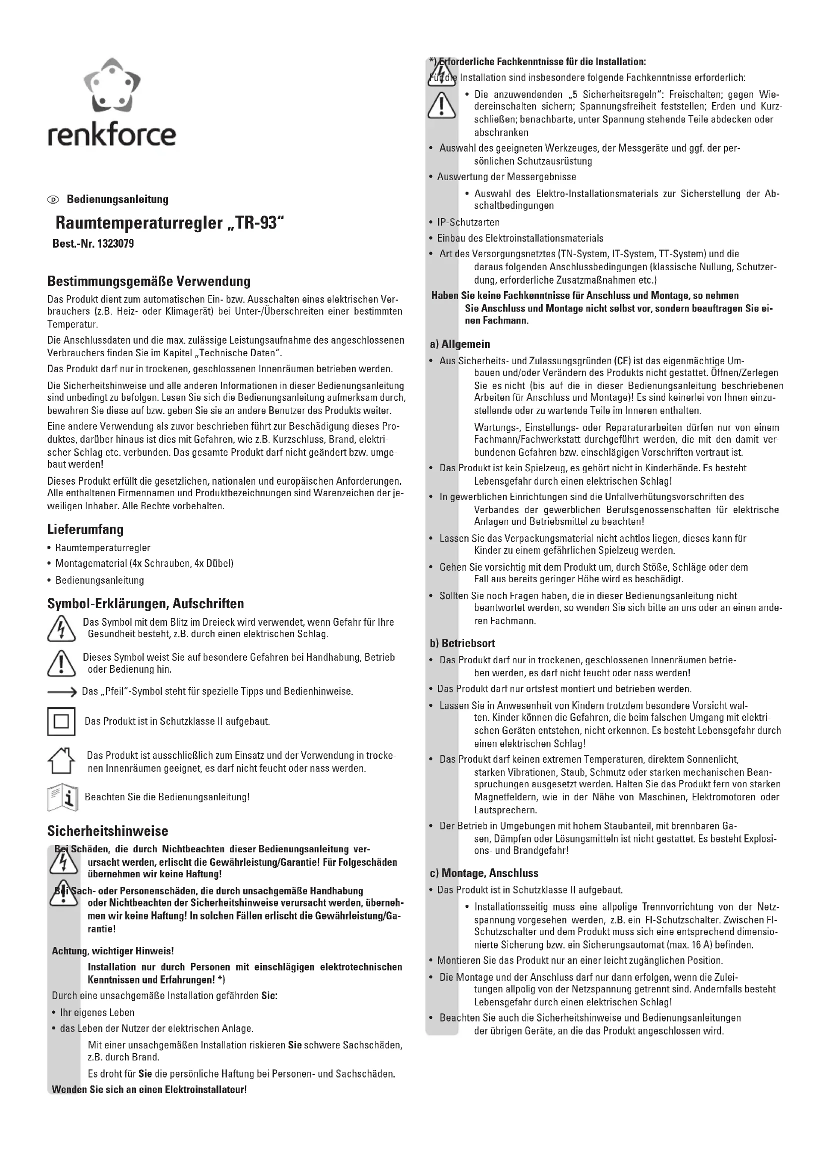 TR93 - Thermostat Renkforce - Kostenlose Bedienungsanleitung
