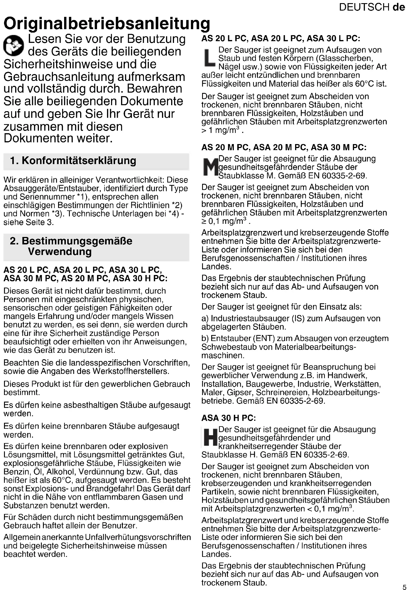 Originalbetriebsanleitung Lesen Sie vor der Benutzung des Geräts die beiliegenden Sicherheitshinweise und die Gebrauchsanleitung aufmerksam und vollständig durch. Bewahren Sie alle beiliegenden Dokumente auf und geben Sie Ihr Gerät nur zusammen mit diesen Dokumenten weiter. Wir erklären in alleiniger Verantwortlichkeit: Diese Absauggeräte/Entstauber, identifiziert durch Type und Seriennummer *1), entsprechen allen einschlägigen Bestimmungen der Richtlinien *2) und Normen *3). Technische Unterlagen bei *4) - siehe Seite 3. AS 20 L PC, ASA 20 L PC, ASA 30 L PC, ASA 30 M PC, AS 20 M PC, ASA 30 H PC: Dieses Gerät ist nicht dafür bestimmt, durch Personen mit eingeschränkten physischen, sensorischen oder geistigen Fähigkeiten oder mangels Erfahrung und/oder mangels Wissen benutzt zu werden, es sei denn, sie werden durch eine für ihre Sicherheit zuständige Person beaufsichtigt oder erhielten von ihr Anweisungen, wie das Gerät zu benutzen ist. Beachten Sie die landesspezifischen Vorschriften, sowie die Angaben des Werkstoffherstellers. Dieses Produkt ist für den gewerblichen Gebrauch bestimmt. Es dürfen keine asbesthaltigen Stäube aufgesaugt werden. Es dürfen keine brennbaren Stäube aufgesaugt werden. Es dürfen keine brennbaren oder explosiven Lösungsmittel, mit Lösungsmittel getränktes Gut, explosionsgefährliche Stäube, Flüssigkeiten wie Benzin, Öl, Alkohol, Verdünnung bzw. Gut, das heißer ist als 60°C, aufgesaugt werden. Es besteht sonst Explosions- und Brandgefahr! Das Gerät darf nicht in die Nähe von entflammbaren Gasen und Substanzen benutzt werden. Für Schäden durch nicht bestimmungsgemäßen Gebrauch haftet allein der Benutzer. Allgemein anerkannte Unfallverhütungsvorschriften und beigelegte Sicherheitshinweise müssen beachtet werden. AS 20 L PC, ASA 20 L PC, ASA 30 L PC: Der Sauger ist geeignet zum Aufsaugen von Staub und festen Körpern (Glasscherben, Nägel usw.) sowie von Flüssigkeiten jeder Art außer leicht entzündlichen und brennbaren Flüssigkeiten und Material das heißer als 60°C ist. Der Sauger ist geeignet zum Abscheiden von trockenen, nicht brennbaren Stäuben, nicht brennbaren Flüssigkeiten, Holzstäuben und gefährlichen Stäuben mit Arbeitsplatzgrenzwerten > 1 mg/m³ . AS 20 M PC, ASA 20 M PC, ASA 30 M PC: Der Sauger ist geeignet für die Absaugung gesundheitsgefährdender Stäube der Staubklasse M. Gemäß EN 60335-2-69. Der Sauger ist geeignet zum Abscheiden von trockenen, nicht brennbaren Stäuben, nicht brennbaren Flüssigkeiten, Holzstäuben und gefährlichen Stäuben mit Arbeitsplatzgrenzwerten ≥ 0,1 mg/m³ . Arbeitsplatzgrenzwert und krebserzeugende Stoffe entnehmen Sie bitte der Arbeitsplatzgrenzwerte- Liste oder informieren Sie sich bei den Berufsgenossenschaften / Institutionen ihres Landes. Das Ergebnis der staubtechnischen Prüfung bezieht sich nur auf das Ab- und Aufsaugen von trockenem Staub. Der Sauger ist geeignet für den Einsatz als: a) Industriestaubsauger (IS) zum Aufsaugen von abgelagerten Stäuben. b) Entstauber (ENT) zum Absaugen von erzeugtem Schwebestaub von Materialbearbeitungs- maschinen. Der Sauger ist geeignet für Beanspruchung bei gewerblicher Verwendung z.B. im Handwerk, Installation, Baugewerbe, Industrie, Werkstätten, Maler, Gipser, Schreinereien, Holzbearbeitungs- betriebe. Gemäß EN 60335-2-69. ASA 30 H PC: Der Sauger ist geeignet für die Absaugung gesundheitsgefährdender und krankheitserregender Stäube der Staubklasse H. Gemäß EN 60335-2-69. Der Sauger ist geeignet zum Abscheiden von trockenen, nicht brennbaren Stäuben, krebserzeugenden und krankheitserregenden Partikeln, sowie nicht brennbaren Flüssigkeiten, Holzstäuben und gesundheitsgefährlichen Stäuben mit Arbeitsplatzgrenzwerten < 0,1 mg/m³. Arbeitsplatzgrenzwert und krebserzeugende Stoffe entnehmen Sie bitte der Arbeitsplatzgrenzwerte- Liste oder informieren Sie sich bei den Berufsgenossenschaften / Institutionen ihres Landes. Das Ergebnis der staubtechnischen Prüfung bezieht sich nur auf das Ab- und Aufsaugen von trockenem Staub.