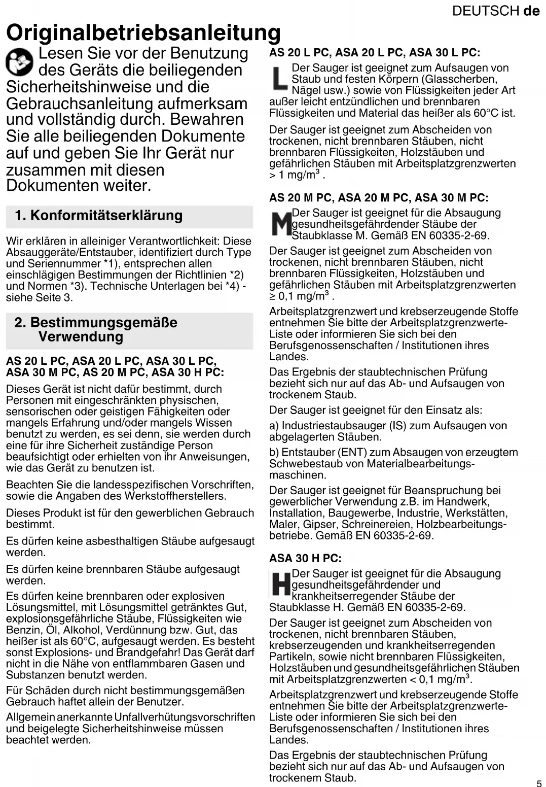 Originalbetriebsanleitung Lesen Sie vor der Benutzung des Geräts die beiliegenden Sicherheitshinweise und die Gebrauchsanleitung aufmerksam und vollständig durch. Bewahren Sie alle beiliegenden Dokumente auf und geben Sie Ihr Gerät nur zusammen mit diesen Dokumenten weiter. Wir erklären in alleiniger Verantwortlichkeit: Diese Absauggeräte/Entstauber, identifiziert durch Type und Seriennummer *1), entsprechen allen einschlägigen Bestimmungen der Richtlinien *2) und Normen *3). Technische Unterlagen bei *4) - siehe Seite 3. AS 20 L PC, ASA 20 L PC, ASA 30 L PC, ASA 30 M PC, AS 20 M PC, ASA 30 H PC: Dieses Gerät ist nicht dafür bestimmt, durch Personen mit eingeschränkten physischen, sensorischen oder geistigen Fähigkeiten oder mangels Erfahrung und/oder mangels Wissen benutzt zu werden, es sei denn, sie werden durch eine für ihre Sicherheit zuständige Person beaufsichtigt oder erhielten von ihr Anweisungen, wie das Gerät zu benutzen ist. Beachten Sie die landesspezifischen Vorschriften, sowie die Angaben des Werkstoffherstellers. Dieses Produkt ist für den gewerblichen Gebrauch bestimmt. Es dürfen keine asbesthaltigen Stäube aufgesaugt werden. Es dürfen keine brennbaren Stäube aufgesaugt werden. Es dürfen keine brennbaren oder explosiven Lösungsmittel, mit Lösungsmittel getränktes Gut, explosionsgefährliche Stäube, Flüssigkeiten wie Benzin, Öl, Alkohol, Verdünnung bzw. Gut, das heißer ist als 60°C, aufgesaugt werden. Es besteht sonst Explosions- und Brandgefahr! Das Gerät darf nicht in die Nähe von entflammbaren Gasen und Substanzen benutzt werden. Für Schäden durch nicht bestimmungsgemäßen Gebrauch haftet allein der Benutzer. Allgemein anerkannte Unfallverhütungsvorschriften und beigelegte Sicherheitshinweise müssen beachtet werden. AS 20 L PC, ASA 20 L PC, ASA 30 L PC: Der Sauger ist geeignet zum Aufsaugen von Staub und festen Körpern (Glasscherben, Nägel usw.) sowie von Flüssigkeiten jeder Art außer leicht entzündlichen und brennbaren Flüssigkeiten und Material das heißer als 60°C ist. Der Sauger ist geeignet zum Abscheiden von trockenen, nicht brennbaren Stäuben, nicht brennbaren Flüssigkeiten, Holzstäuben und gefährlichen Stäuben mit Arbeitsplatzgrenzwerten > 1 mg/m³ . AS 20 M PC, ASA 20 M PC, ASA 30 M PC: Der Sauger ist geeignet für die Absaugung gesundheitsgefährdender Stäube der Staubklasse M. Gemäß EN 60335-2-69. Der Sauger ist geeignet zum Abscheiden von trockenen, nicht brennbaren Stäuben, nicht brennbaren Flüssigkeiten, Holzstäuben und gefährlichen Stäuben mit Arbeitsplatzgrenzwerten ≥ 0,1 mg/m³ . Arbeitsplatzgrenzwert und krebserzeugende Stoffe entnehmen Sie bitte der Arbeitsplatzgrenzwerte- Liste oder informieren Sie sich bei den Berufsgenossenschaften / Institutionen ihres Landes. Das Ergebnis der staubtechnischen Prüfung bezieht sich nur auf das Ab- und Aufsaugen von trockenem Staub. Der Sauger ist geeignet für den Einsatz als: a) Industriestaubsauger (IS) zum Aufsaugen von abgelagerten Stäuben. b) Entstauber (ENT) zum Absaugen von erzeugtem Schwebestaub von Materialbearbeitungs- maschinen. Der Sauger ist geeignet für Beanspruchung bei gewerblicher Verwendung z.B. im Handwerk, Installation, Baugewerbe, Industrie, Werkstätten, Maler, Gipser, Schreinereien, Holzbearbeitungs- betriebe. Gemäß EN 60335-2-69. ASA 30 H PC: Der Sauger ist geeignet für die Absaugung gesundheitsgefährdender und krankheitserregender Stäube der Staubklasse H. Gemäß EN 60335-2-69. Der Sauger ist geeignet zum Abscheiden von trockenen, nicht brennbaren Stäuben, krebserzeugenden und krankheitserregenden Partikeln, sowie nicht brennbaren Flüssigkeiten, Holzstäuben und gesundheitsgefährlichen Stäuben mit Arbeitsplatzgrenzwerten < 0,1 mg/m³. Arbeitsplatzgrenzwert und krebserzeugende Stoffe entnehmen Sie bitte der Arbeitsplatzgrenzwerte- Liste oder informieren Sie sich bei den Berufsgenossenschaften / Institutionen ihres Landes. Das Ergebnis der staubtechnischen Prüfung bezieht sich nur auf das Ab- und Aufsaugen von trockenem Staub.