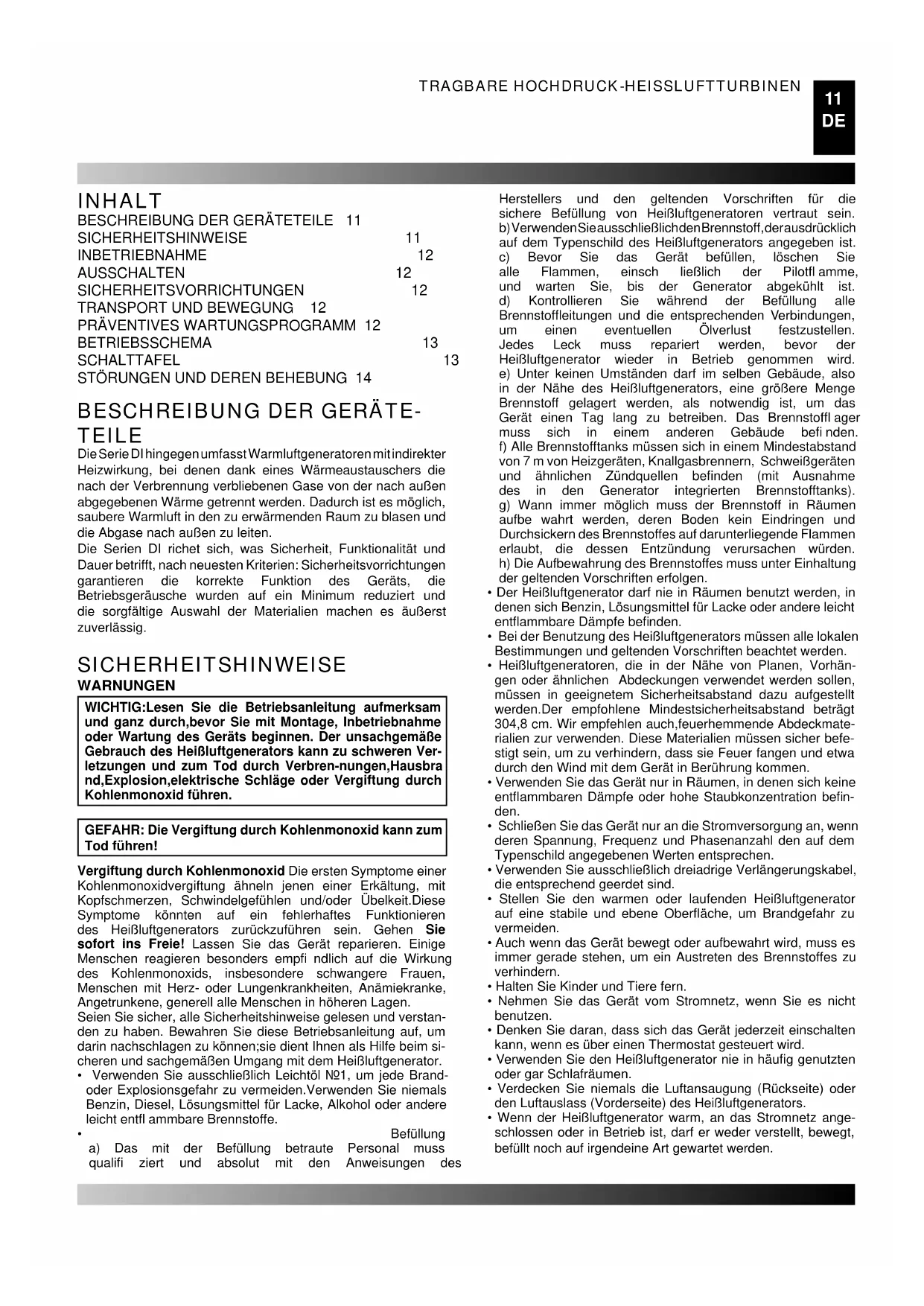 TEILE Die Serie DI hingegen umfasst Warmluftgeneratoren mit indirekter Heizwirkung, bei denen dank eines Wärmeaustauschers die nach der Verbrennung verbliebenen Gase von der nach außen abgegebenen Wärme getrennt werden. Dadurch ist es möglich, saubere Warmluft in den zu erwärmenden Raum zu blasen und die Abgase nach außen zu leiten. Die Serien DI richet sich, was Sicherheit, Funktionalität und Dauer betrifft, nach neuesten Kriterien: Sicherheitsvorrichtungen garantieren die korrekte Funktion des Geräts, die Betriebsgeräusche wurden auf ein Minimum reduziert und die sorgfältige Auswahl der Materialien machen es äußerst zuverlässig. SICHERHEITSHINWEISE WARNUNGEN WICHTIG:Lesen Sie die Betriebsanleitung aufmerksam und ganz durch,bevor Sie mit Montage, Inbetriebnahme oder Wartung des Geräts beginnen. Der unsachgemäße Gebrauch des Heißluftgenerators kann zu schweren Ver- letzungen und zum Tod durch Verbren-nungen,Hausbra nd,Explosion,elektrische Schläge oder Vergiftung durch Kohlenmonoxid führen. GEFAHR: Die Vergiftung durch Kohlenmonoxid kann zum Tod führen! Vergiftung durch Kohlenmonoxid Die ersten Symptome einer Kohlenmonoxidvergiftung ähneln jenen einer Erkältung, mit Kopfschmerzen, Schwindelgefühlen und/oder Übelkeit.Diese Symptome könnten auf ein fehlerhaftes Funktionieren des Heißluftgenerators zurückzuführen sein. Gehen Sie sofort ins Freie! Lassen Sie das Gerät reparieren. Einige Menschen reagieren besonders empfi ndlich auf die Wirkung des Kohlenmonoxids, insbesondere schwangere Frauen, Menschen mit Herz- oder Lungenkrankheiten, Anämiekranke, Angetrunkene, generell alle Menschen in höheren Lagen. Seien Sie sicher, alle Sicherheitshinweise gelesen und verstan- den zu haben. Bewahren Sie diese Betriebsanleitung auf, um darin nachschlagen zu können;sie dient Ihnen als Hilfe beim si- cheren und sachgemäßen Umgang mit dem Heißluftgenerator.
