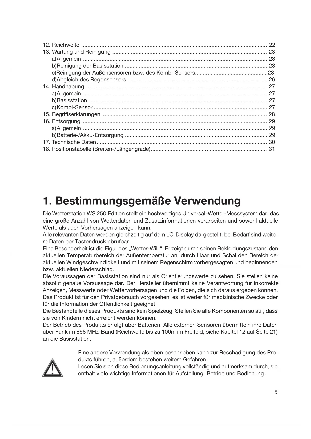 Die Wetterstation WS 250 Edition stellt ein hochwertiges Universal-Wetter-Messsystem dar, das eine große Anzahl von Wetterdaten und Zusatzinformationen verarbeiten und sowohl aktuelle Werte als auch Vorhersagen anzeigen kann. Alle relevanten Daten werden gleichzeitig auf dem LC-Display dargestellt, bei Bedarf sind weite- re Daten per Tastendruck abrufbar. Eine Besonderheit ist die Figur des „Wetter-Willi“. Er zeigt durch seinen Bekleidungszustand den aktuellen Temperaturbereich der Außentemperatur an, durch Haar und Schal den Bereich der aktuellen Windgeschwindigkeit und mit seinem Regenschirm vorhergesagten und beginnenden bzw. aktuellen Niederschlag. Die Voraussagen der Basisstation sind nur als Orientierungswerte zu sehen. Sie stellen keine absolut genaue Voraussage dar. Der Hersteller übernimmt keine Verantwortung für inkorrekte Anzeigen, Messwerte oder Wettervorhersagen und die Folgen, die sich daraus ergeben können. Das Produkt ist für den Privatgebrauch vorgesehen; es ist weder für medizinische Zwecke oder für die Information der Öffentlichkeit geeignet. Die Bestandteile dieses Produkts sind kein Spielzeug. Stellen Sie alle Komponenten so auf, dass sie von Kindern nicht erreicht werden können. Der Betrieb des Produkts erfolgt über Batterien. Alle externen Sensoren übermitteln ihre Daten über Funk im 868 MHz-Band (Reichweite bis zu 100m im Freifeld, siehe Kapitel 12 auf Seite 21) an die Basisstation. Eine andere Verwendung als oben beschrieben kann zur Beschädigung des Pro- dukts führen, außerdem bestehen weitere Gefahren. Lesen Sie sich diese Bedienungsanleitung vollständig und aufmerksam durch, sie enthält viele wichtige Informationen für Aufstellung, Betrieb und Bedienung.6