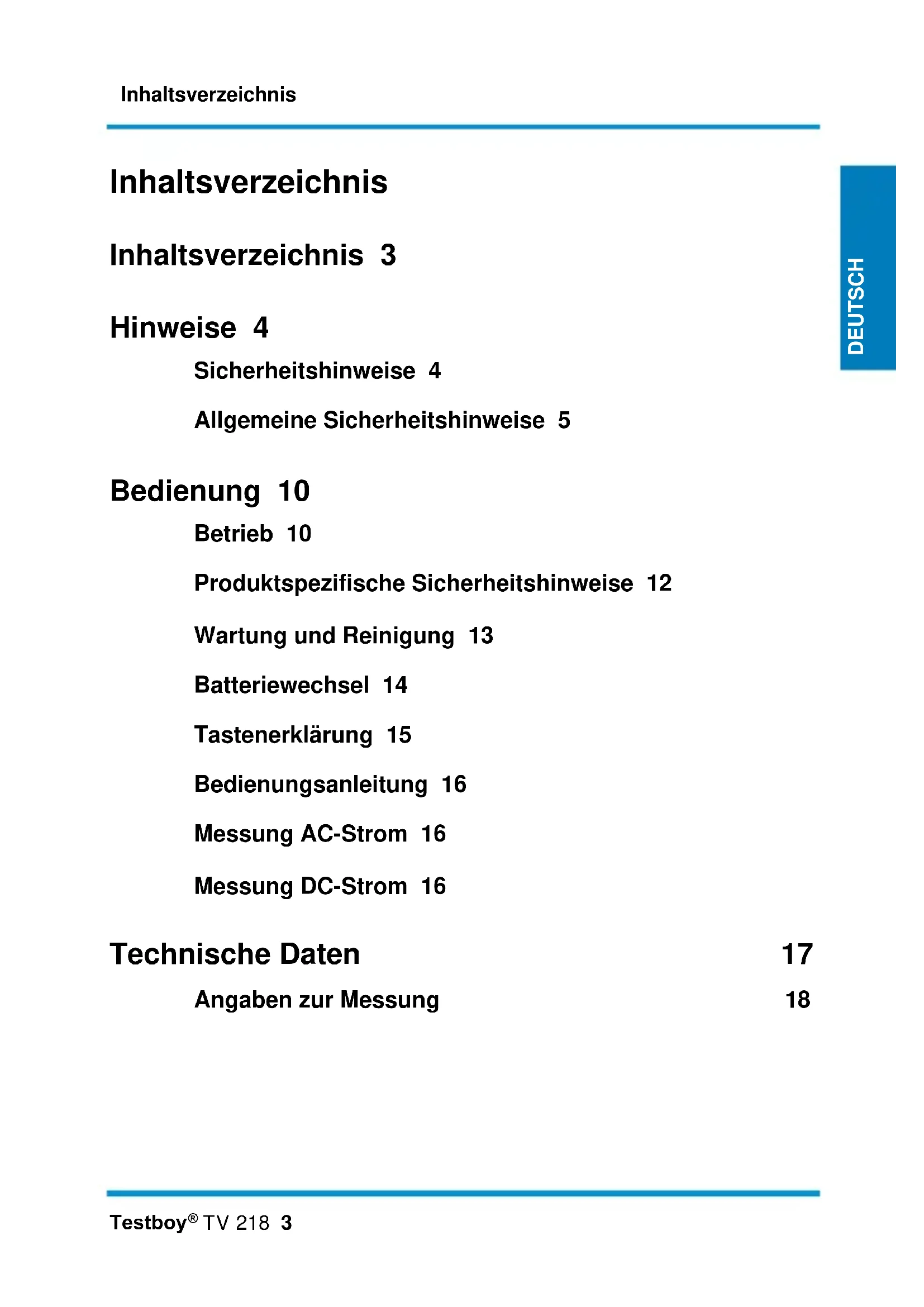 TV 218 3 DEUTSCH DEUTSCH DEUTSCH Inhaltsverzeichnis Inhaltsverzeichnis 3 Hinweise 4 Sicherheitshinweise 4 Allgemeine Sicherheitshinweise 5 Bedienung 10 Betrieb 10 Produktspezifische Sicherheitshinweise 12 Wartung und Reinigung 13 Batteriewechsel 14 Tastenerklärung 15 Bedienungsanleitung 16 Messung AC-Strom 16 Messung DC-Strom 16 Technische Daten 17 Angaben zur Messung 18Hinweise