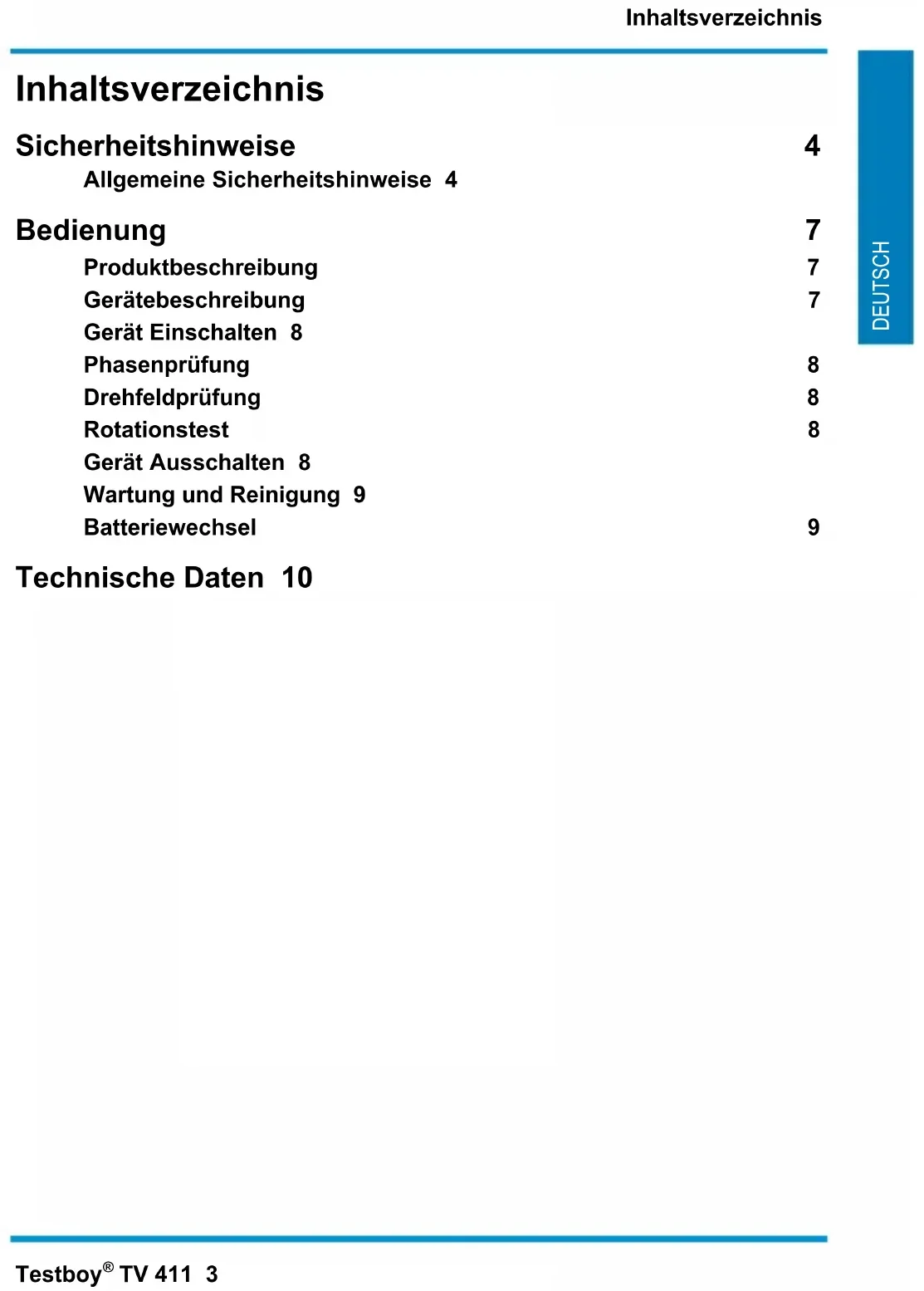 TV 411 3 DEUTSCH Inhaltsverzeichnis Sicherheitshinweise 4 Allgemeine Sicherheitshinweise 4 Bedienung 7 Produktbeschreibung 7 Gerätebeschreibung 7 Gerät Einschalten 8 Phasenprüfung 8 Drehfeldprüfung 8 Rotationstest 8 Gerät Ausschalten 8 Wartung und Reinigung 9 Batteriewechsel 9 Technische Daten 10Sicherheitshinweise 4 Testboy