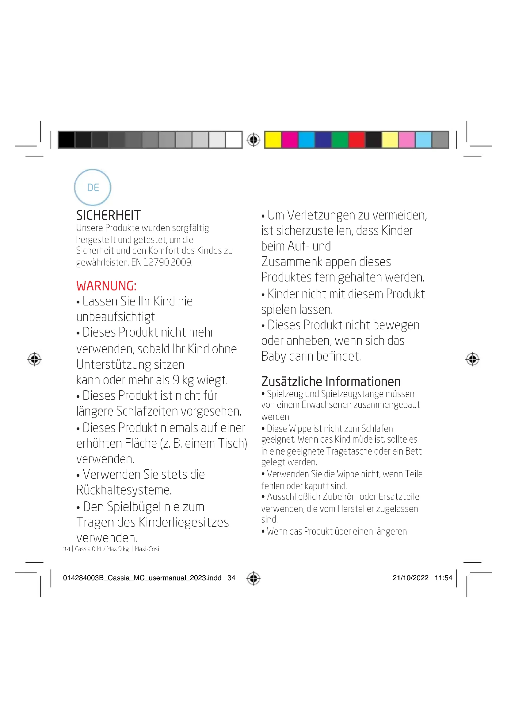 Maxi-Cosi SICHERHEIT Unsere Produkte wurden sorgfältig hergestellt und getestet, um die Sicherheit und den Komfort des Kindes zu gewährleisten. EN 12790:2009. WARNUNG: