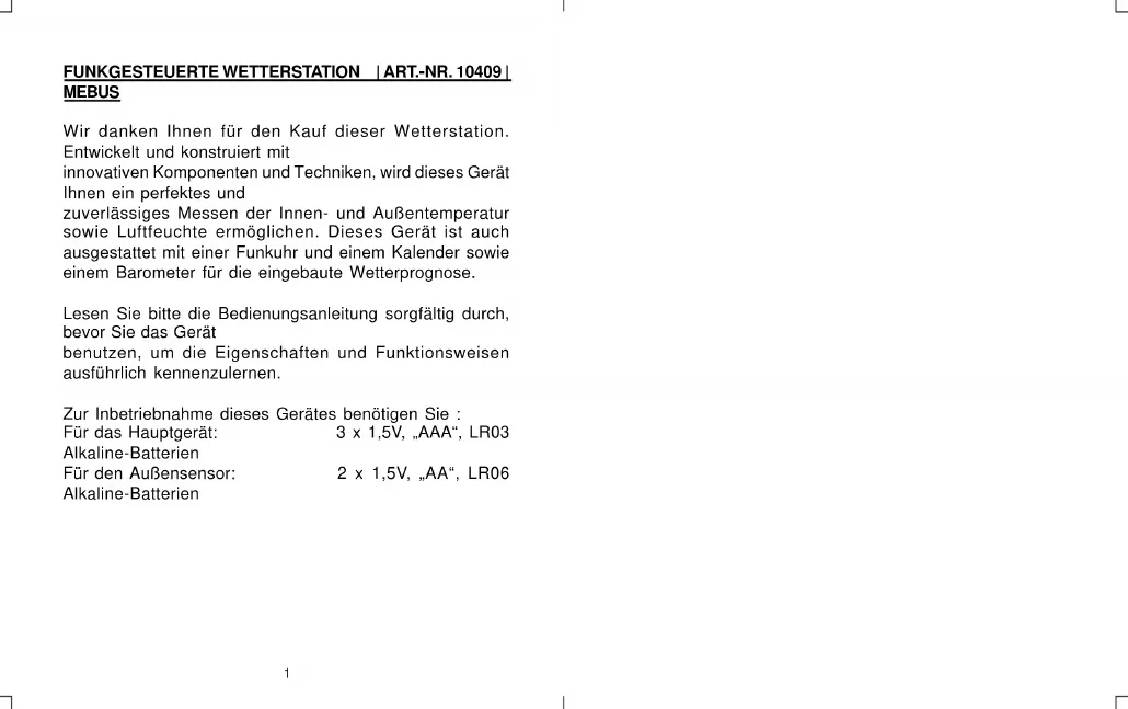 MEBUS Wir danken Ihnen für den Kauf dieser Wetterstation. Entwickelt und konstruiert mit innovativen Komponenten und Techniken, wird dieses Gerät Ihnen ein perfektes und zuverlässiges Messen der Innen- und Außentemperatur sowie Luftfeuchte ermöglichen. Dieses Gerät ist auch ausgestattet mit einer Funkuhr und einem Kalender sowie einem Barometer für die eingebaute Wetterprognose. Lesen Sie bitte die Bedienungsanleitung sorgfältig durch, bevor Sie das Gerät benutzen, um die Eigenschaften und Funktionsweisen ausführlich kennenzulernen. Zur Inbetriebnahme dieses Gerätes benötigen Sie : Für das Hauptgerät: 3 x 1,5V, „AAA“, LR03 Alkaline-Batterien Für den Außensensor: 2 x 1,5V, „AA“, LR06 Alkaline-Batterien 1Hauptgerät Wetterstation: LCD DISPLAY