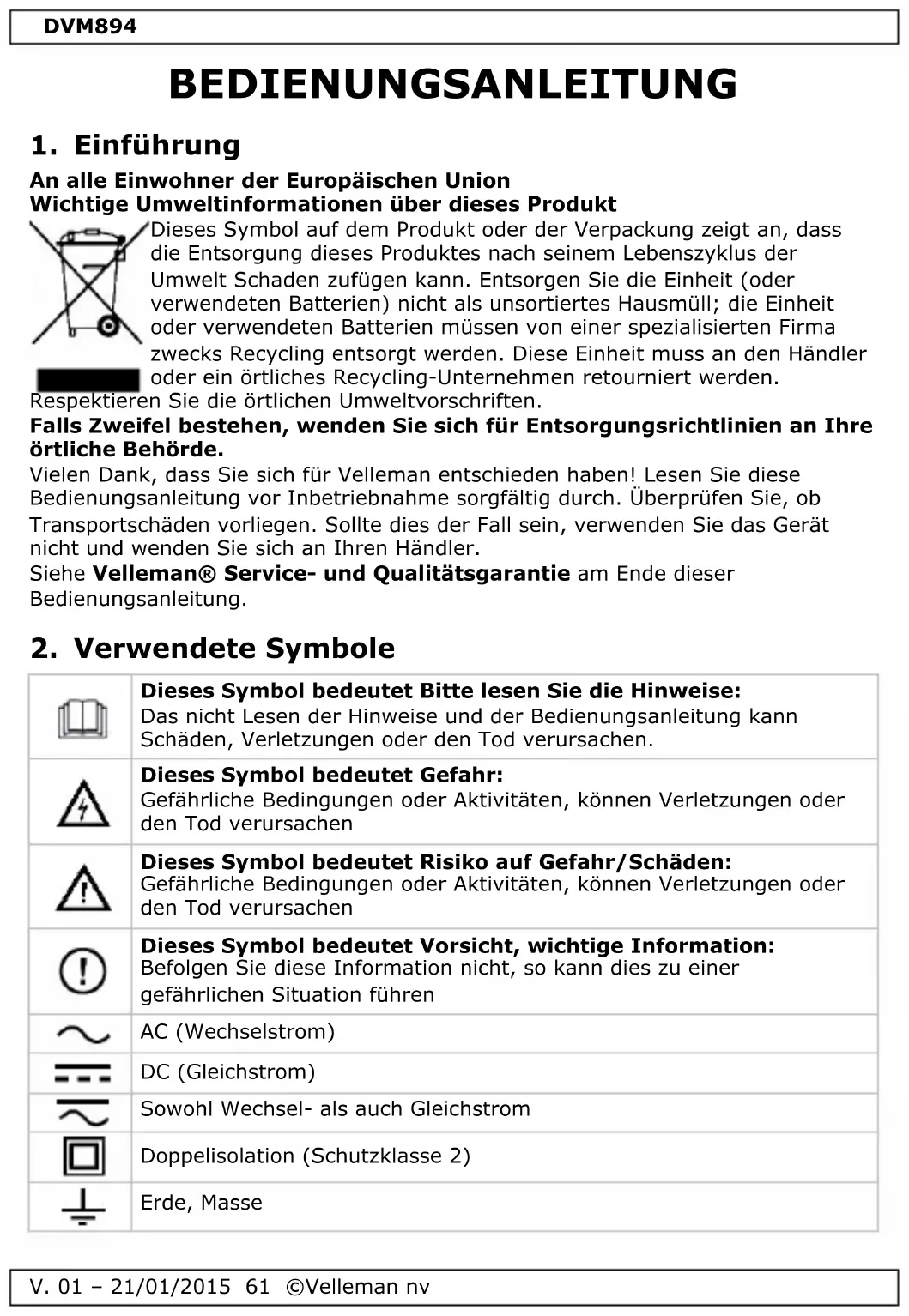 Verwenden Sie dieses Gerät nur mit originellen Zubehörteilen. Velleman NV übernimmt keine Haftung für Schaden oder Verletzungen bei (falscher) Anwendung dieses Gerätes. Mehr Informationen zu diesem Produkt und die neueste Version dieser Bedienungsanleitung finden Sie hier: www.velleman.eu. Alle Änderungen ohne vorherige Ankündigung vorbehalten. © URHEBERRECHT Velleman NV besitzt das Urheberrecht für diese Bedienungsanleitung. Alle weltweiten Rechte vorbehalten. Ohne vorherige schriftliche Genehmigung des Urhebers ist es nicht gestattet, diese Bedienungsanleitung ganz oder in Teilen zu reproduzieren, zu kopieren, zu übersetzen, zu bearbeiten oder zu speichern.DVM894