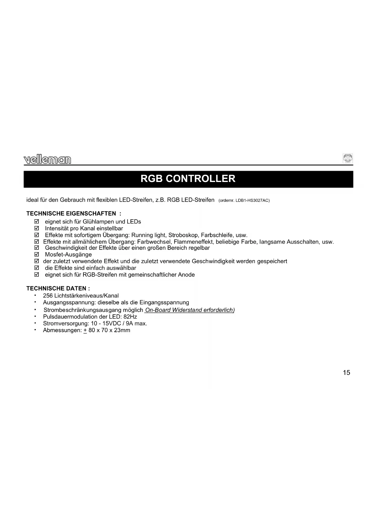 Feu de signalisation Séquence Vert, Bleu, Rouge, Vert. Utilisez la sortie bleue pour la couleur jaune La vitesse des effets 2 à 11 peut être réglée. Enfoncez (11) pour augmenter la vitesse, enfoncez (10) pour la diminuer. Mémoire : Une fois l’effet et sa vitesse sélectionnés, il est possible de les mémoriser en plaçant le sélecteur de mode en position "RGB". Lors d’une prochaine activation du contrôleur, placez le sélecteur sur "eff" pour retourner à l’effet sélec- tionné. Assemblez comme illustré dans l’illustration. Ensuite, collez les autocollants à l’endroit correct.15 RGB CONTROLLER ideal für den Gebrauch mit flexiblen LED-Streifen, z.B. RGB LED-Streifen (ordernr. LDB1-HS3027AC) TECHNISCHE EIGENSCHAFTEN : eignet sich für Glühlampen und LEDs Intensität pro Kanal einstellbar Effekte mit sofortigem Übergang: Running light, Stroboskop, Farbschleife, usw. Effekte mit allmählichem Übergang: Farbwechsel, Flammeneffekt, beliebige Farbe, langsame Ausschalten, usw. Geschwindigkeit der Effekte über einen großen Bereich regelbar Mosfet-Ausgänge der zuletzt verwendete Effekt und die zuletzt verwendete Geschwindigkeit werden gespeichert die Effekte sind einfach auswählbar eignet sich für RGB-Streifen mit gemeinschaftlicher Anode TECHNISCHE DATEN : 256 Lichtstärkeniveaus/Kanal Ausgangsspannung: dieselbe als die Eingangsspannung Strombeschränkungsausgang möglich On-Board Widerstand erforderlich) Pulsdauermodulation der LED: 82Hz Stromversorgung: 10 - 15VDC / 9A max. Abmessungen: + 80 x 70 x 23mm16