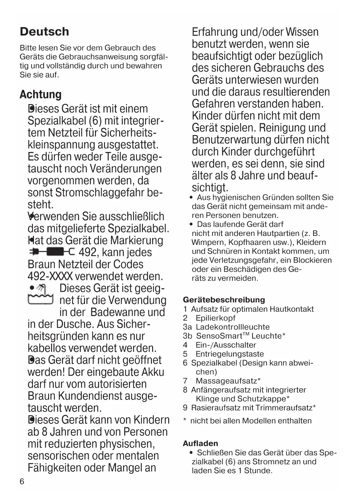- Das Gerät kann auch auf nasser Haut angewendet werden, sogar unter flie- ßendem Wasser. Stellen Sie sicher, dass Ihre Haut gut angefeuchtet ist. Für optimales Gleiten können Sie während dem Epilieren Duschgel anwenden. Der Epilierkopf (2) ist mit verschiedenen Aufsätzen ausgestattet (1, 7 oder 8, abhängig vom Modell). Wählen Sie den Aufsatz je nach Ihren Bedürfnissen: Aufsatz für optimalen Hautkontakt (1): sorgt für eine perfekte Anpassung in allen Anwendungszonen. Die SensoSmart Leuchte erinnert durch rotes Leuchten daran, nicht zu fest aufzu- drücken. Massageaufsatz (7): kann anstelle des Aufsatzes (1) verwendet werden. Er sti- muliert die Haut und macht dadurch den Epilierprozess angenehmer. Straffen Sie immer Ihre Haut während dem Epilieren. Halten Sie das Gerät in einem rechten Winkel (90°) an Ihre Haut und führen Sie es in einer langsamen, gleichmäßigen Bewegung mit der Ein-/ Ausschalter-Seite entgegen der Haar- wuchsrichtung. Epilation der Beine: Epilieren Sie die Beine von unten nach oben. Bei der Anwendung an den Kniekehlen sollte das Bein immer gestreckt sein. Epilation im Achselbereich und in der Bikinizone: Da diese Körperzonen besonders schmerzempfindlich sind, empfehlen wir Geschwindigkeitsstufe 1. Bei wiederholter Anwendung lässt das Schmerzempfinden nach. Vor dem Epilieren sollten Sie den entsprechenden Bereich gründlich reini- gen, um Rückstände zu entfernen (z. B. Deodorant). Bei der Anwendung im Achsel- bereich strecken Sie den Arm nach oben und führen Sie das Gerät in verschiedene Richtungen über die Haut, um alle Härchen zu erfassen, die in verschiedene Richtun- gen wachsen können. Der Anfängeraufsatz (8) für die Ein gewöhnungsphase kombiniert Epilation und Rasur. Er wurde ausschließlich für8 die Bein-Anwendung auf nasser Haut entwickelt. Verwenden Sie immer Rasiergel oder -schaum auf nasser Haut wenn Sie den Anfängeraufsatz nutzen. Verwenden Sie in der Anfangsphase (die ersten 4 Wochen) den Epilierer mit dem Anfängeraufsatz einmal pro Woche zum Epilieren und Rasieren. Seien Sie achtsam an knochigen oder unebenen Stellen, um Verletzungen durch die Rasierklinge zu vermeiden. Entfernen Sie nach jeder Anwendungen den Schaum, der sich im Aufsatz ansammelt. Nach 4 Wochen wer- den Sie sich an die Haarentfernung gewöhnt haben und können nun auch die anderen Aufsätze (1 oder 7) anwenden. Wenn Sie den Anfängeraufsatz weiterhin nutzen möchten, tauschen Sie ihn nach 12 Anwendungen aus (oder sobald die Rasierleistung nachlässt bzw. die Klinge Verschleißerscheinungen aufweist). Ersatz-Aufsätze sind beim Händler, beim Braun Kundendienst oder über www.service.braun.com erhältlich. Tipps für die Epilation