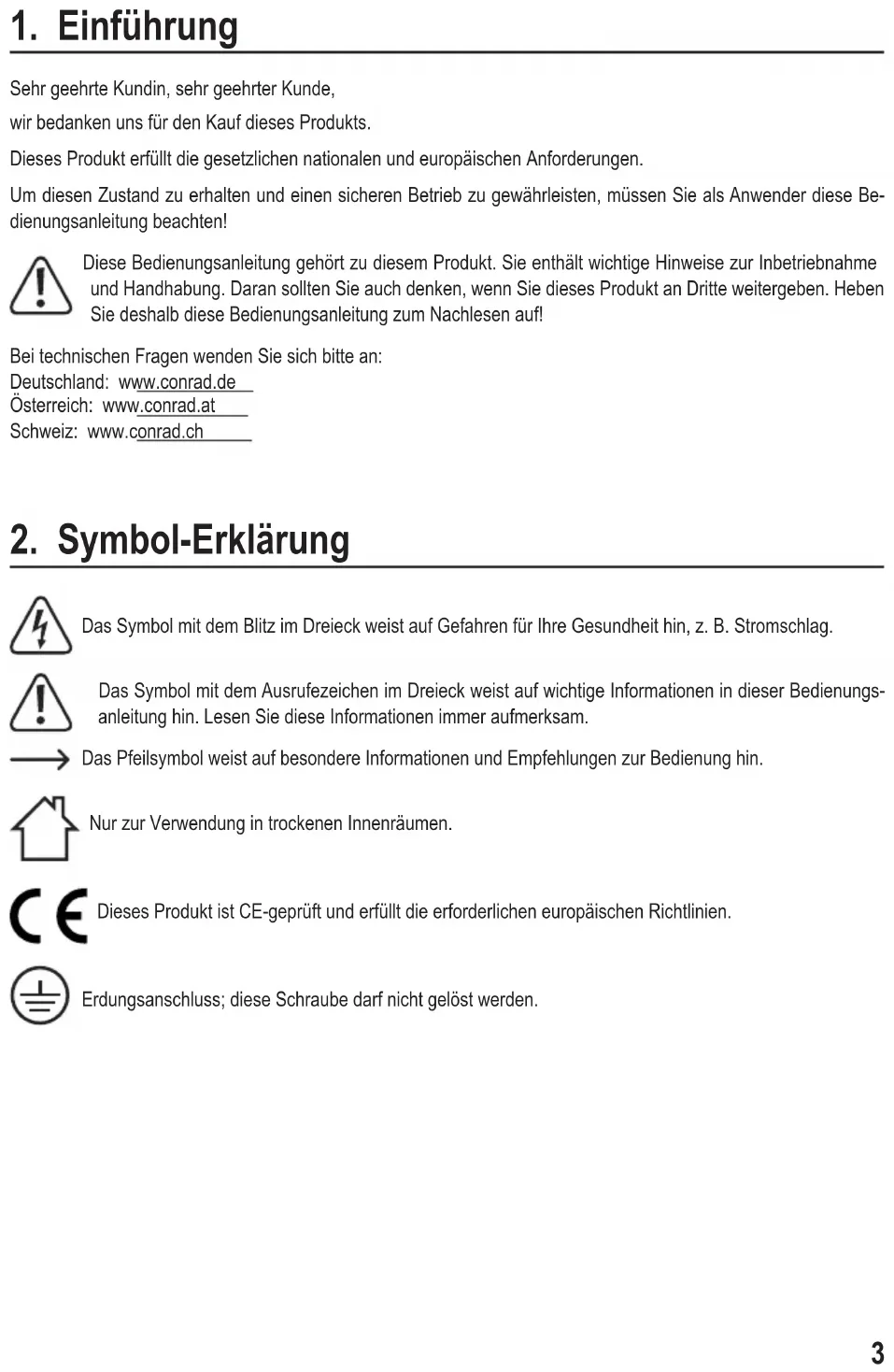 Sehr geehrte Kundin, sehr geehrter Kunde, wir bedanken uns für den Kauf dieses Produkts. Dieses Produkt erfüllt die gesetzlichen nationalen und europäischen Anforderungen. Um diesen Zustand zu erhalten und einen sicheren Betrieb zu gewährleisten, müssen Sie als Anwender diese Be- dienungsanleitung beachten! Diese Bedienungsanleitung gehört zu diesem Produkt. Sie enthält wichtige Hinweise zur Inbetriebnahme und Handhabung. Daran sollten Sie auch denken, wenn Sie dieses Produkt an Dritte weitergeben. Heben Sie deshalb diese Bedienungsanleitung zum Nachlesen auf! Bei technischen Fragen wenden Sie sich bitte an: Deutschland: www.conrad.de Österreich: www.conrad.at Schweiz: www.conrad.ch