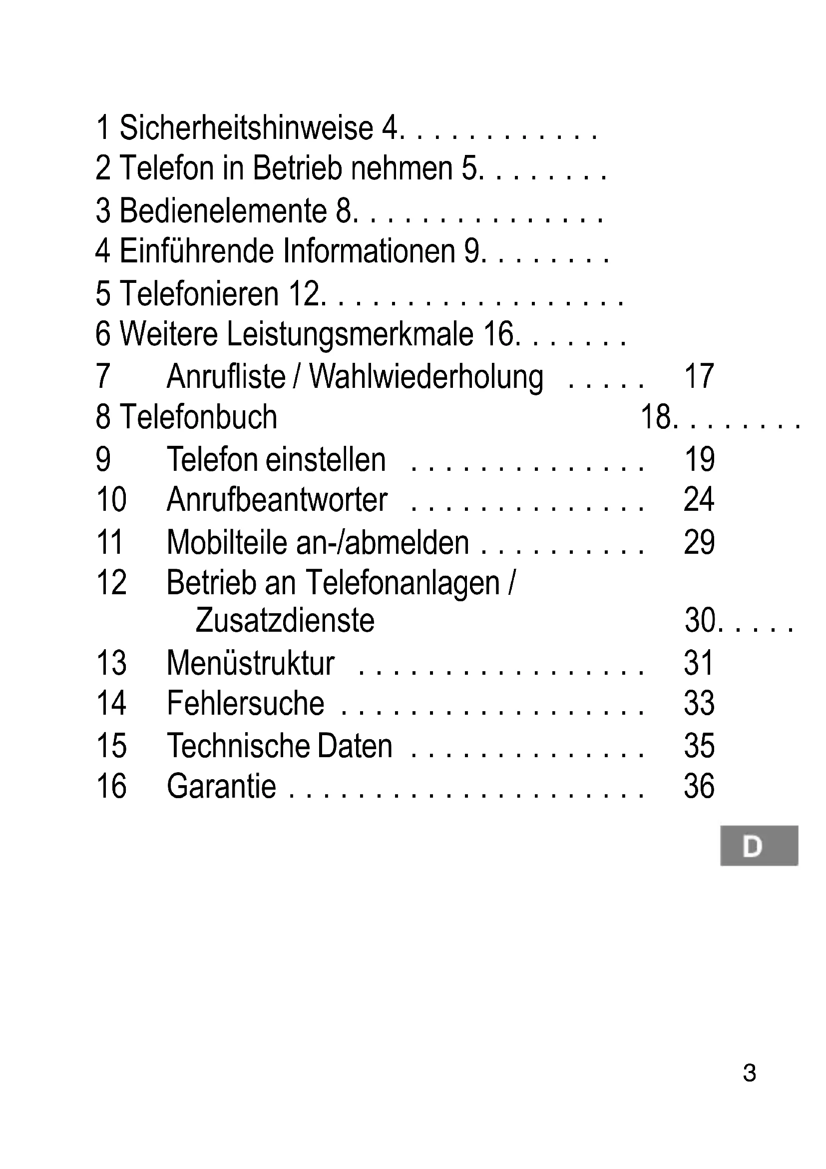 - Garantie 36 1 Sicherheitshinweise Lesen Sie diese Bedienungsanleitung sorgfältig durch. Bestimmungsgemäße Verwendung Dieses Telefon ist geeignet zum Telefonieren innerhalb eines Telefonnet- zes. Jede andere Verwendung gilt als nicht bestimmungsgemäß. Eigen- mächtige Veränderungen oder Umbauten sind nicht zulässig. Öffnen Sie das Gerät in keinem Fall selbst und führen Sie keine eigenen Reparatur- versuche durch. Aufstellungsort Vermeiden Sie Belastungen durch Rauch, Staub, Erschütterungen, Chemi- kalien, Feuchtigkeit, Hitze oder direkte Sonneneinstrahlung. Verwenden Sie das Mobilteil nicht in explosionsgefährdeten Bereichen. Netzteil Achtung: Verwenden Sie nur das mitgelieferte Steckernetzteil, da andere Netzteile das Telefon beschädigen können. Sie dür- fen den Zugang zum Steckernetzteil nicht durch Möbel oder an- dere Gegenstände versperren. Aufladbare Akkus Achtung: Werfen Sie Akkus nicht ins Feuer. Verwenden Sie nur Akkus des gleichen Typs! Achten Sie auf die richtige Polung! Bei verkehrter Polung der Akkus besteht beim Aufladen Explosions- gefahr. Stromausfall Bei Stromausfall kann mit diesem Telefon nicht telefoniert werden. Halten Sie für Notfälle ein schnurgebundenes Telefon bereit, welches ohne ex- terne Stromversorgung arbeitet. Medizinische Geräte Achtung: Benutzen Sie das Telefon nicht in der Nähe von medi- zinischen Geräten. Eine Beeinflussung kann nicht völlig ausge- schlossen werden. DECT p. 4