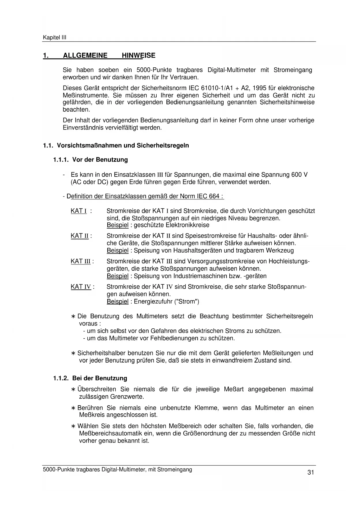 Sie haben soeben ein 5000-Punkte tragbares Digital-Multimeter mit Stromeingang erworben und wir danken Ihnen für Ihr Vertrauen. Dieses Gerät entspricht der Sicherheitsnorm IEC 61010-1/A1 + A2, 1995 für elektronische Meßinstrumente. Sie müssen zu Ihrer eigenen Sicherheit und um das Gerät nicht zu gefährden, die in der vorliegenden Bedienungsanleitung genannten Sicherheitshinweise beachten. Der Inhalt der vorliegenden Bedienungsanleitung darf in keiner Form ohne unser vorherige Einverständnis vervielfältigt werden. 1.1. Vorsichtsmaßnahmen und Sicherheitsregeln