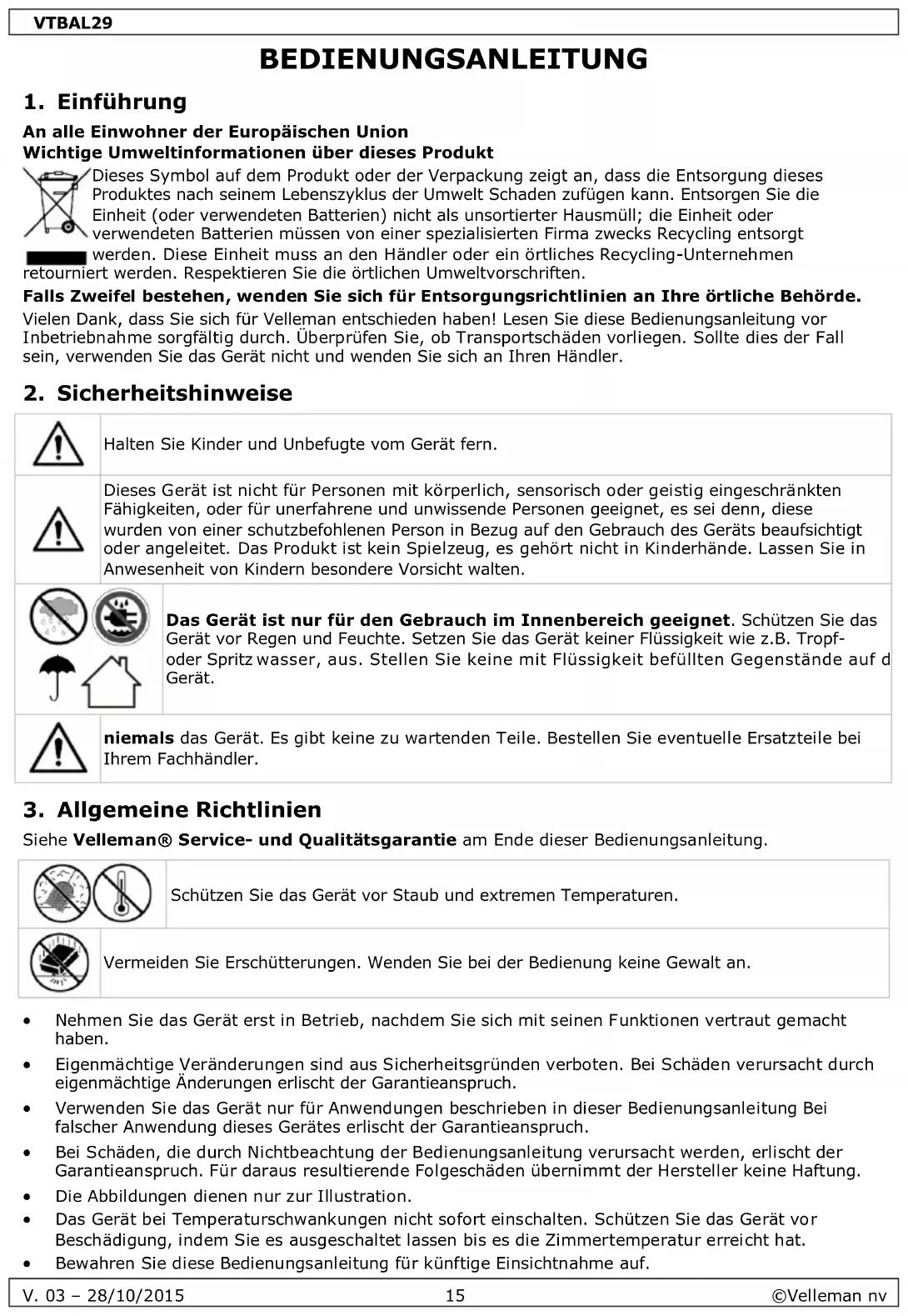 Verwenden Sie dieses Gerät nur mit originellen Zubehörteilen. Velleman NV übernimmt keine Haftung für Schaden oder Verletzungen bei (falscher) Anwendung dieses Gerätes. Mehr Informationen zu diesem Produkt und die neueste Version dieser Bedienungsanleitung finden Sie hier: www.velleman.eu. Alle Änderungen ohne vorherige Ankündigung vorbehalten. © URHEBERRECHT Velleman NV besitzt das Urheberrecht für diese Bedienungsanleitung. Alle weltweiten Rechte vorbehalten. Ohne vorherige schriftliche Genehmigung des Urhebers ist es nicht gestattet, diese Bedienungsanleitung ganz oder in Teilen zu reproduzieren, zu kopieren, zu übersetzen, zu bearbeiten oder zu speichern.VTBAL29