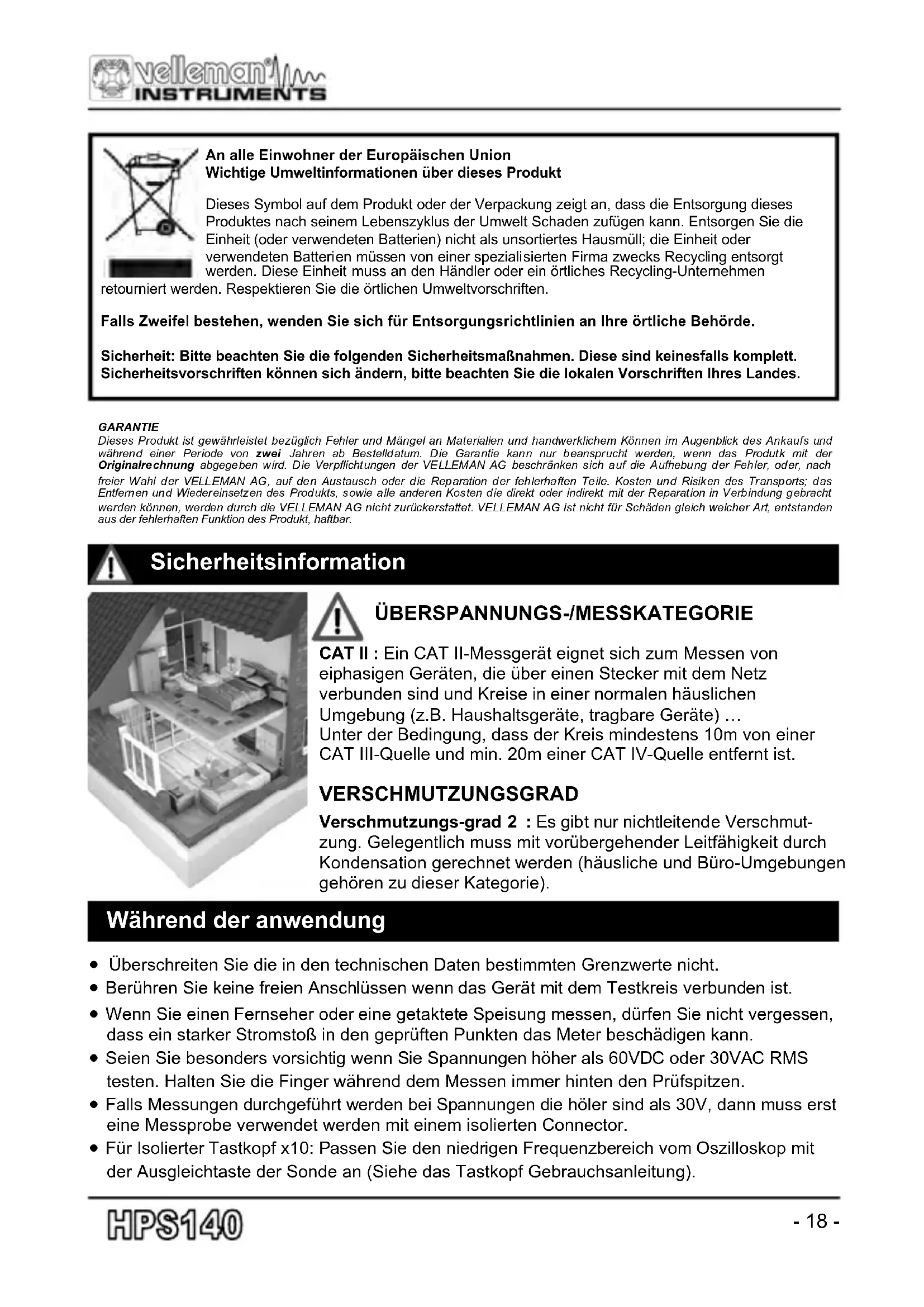 CAT II : Ein CAT II-Messgerät eignet sich zum Messen von eiphasigen Geräten, die über einen Stecker mit dem Netz verbunden sind und Kreise in einer normalen häuslichen Umgebung (z.B. Haushaltsgeräte, tragbare Geräte) … Unter der Bedingung, dass der Kreis mindestens 10m von einer CAT III-Quelle und min. 20m einer CAT IV-Quelle entfernt ist. VERSCHMUTZUNGSGRAD Verschmutzungs-grad 2 : Es gibt nur nichtleitende Verschmut- zung. Gelegentlich muss mit vorübergehender Leitfähigkeit durch Kondensation gerechnet werden (häusliche und Büro-Umgebungen gehören zu dieser Kategorie). An alle Einwohner der Europäischen Union Wichtige Umweltinformationen über dieses Produkt Dieses Symbol auf dem Produkt oder der Verpackung zeigt an, dass die Entsorgung dieses Produktes nach seinem Lebenszyklus der Umwelt Schaden zufügen kann. Entsorgen Sie die Einheit (oder verwendeten Batterien) nicht als unsortiertes Hausmüll; die Einheit oder verwendeten Batterien müssen von einer spezialisierten Firma zwecks Recycling entsorgt werden. Diese Einheit muss an den Händler oder ein örtliches Recycling-Unternehmen retourniert werden. Respektieren Sie die örtlichen Umweltvorschriften. Falls Zweifel bestehen, wenden Sie sich für Entsorgungsrichtlinien an Ihre örtliche Behörde. Sicherheit: Bitte beachten Sie die folgenden Sicherheitsmaßnahmen. Diese sind keinesfalls komplett. Sicherheitsvorschriften können sich ändern, bitte beachten Sie die lokalen Vorschriften Ihres Landes. GARANTIE Dieses Produkt ist gewährleistet bezüglich Fehler und Mängel an Materialien und handwerklichem Können im Augenblick des Ankaufs und während einer Periode von zwei Jahren ab Bestelldatum. Die Garantie kann nur beansprucht werden, wenn das Produtk mit der Originalrechnung abgegeben wird. Die Verpflichtungen der VELLEMAN AG beschränken sich auf die Aufhebung der Fehler, oder, nach freier Wahl der VELLEMAN AG, auf den Austausch oder die Reparation der fehlerhaften Teile. Kosten und Risiken des Transports; das Entfernen und Wiedereinsetzen des Produkts, sowie alle anderen Kosten die direkt oder indirekt mit der Reparation in Verbindung gebracht werden können, werden durch die VELLEMAN AG nicht zurückerstattet. VELLEMAN AG ist nicht für Schäden gleich welcher Art, entstanden aus der fehlerhaften Funktion des Produkt, haftbar.