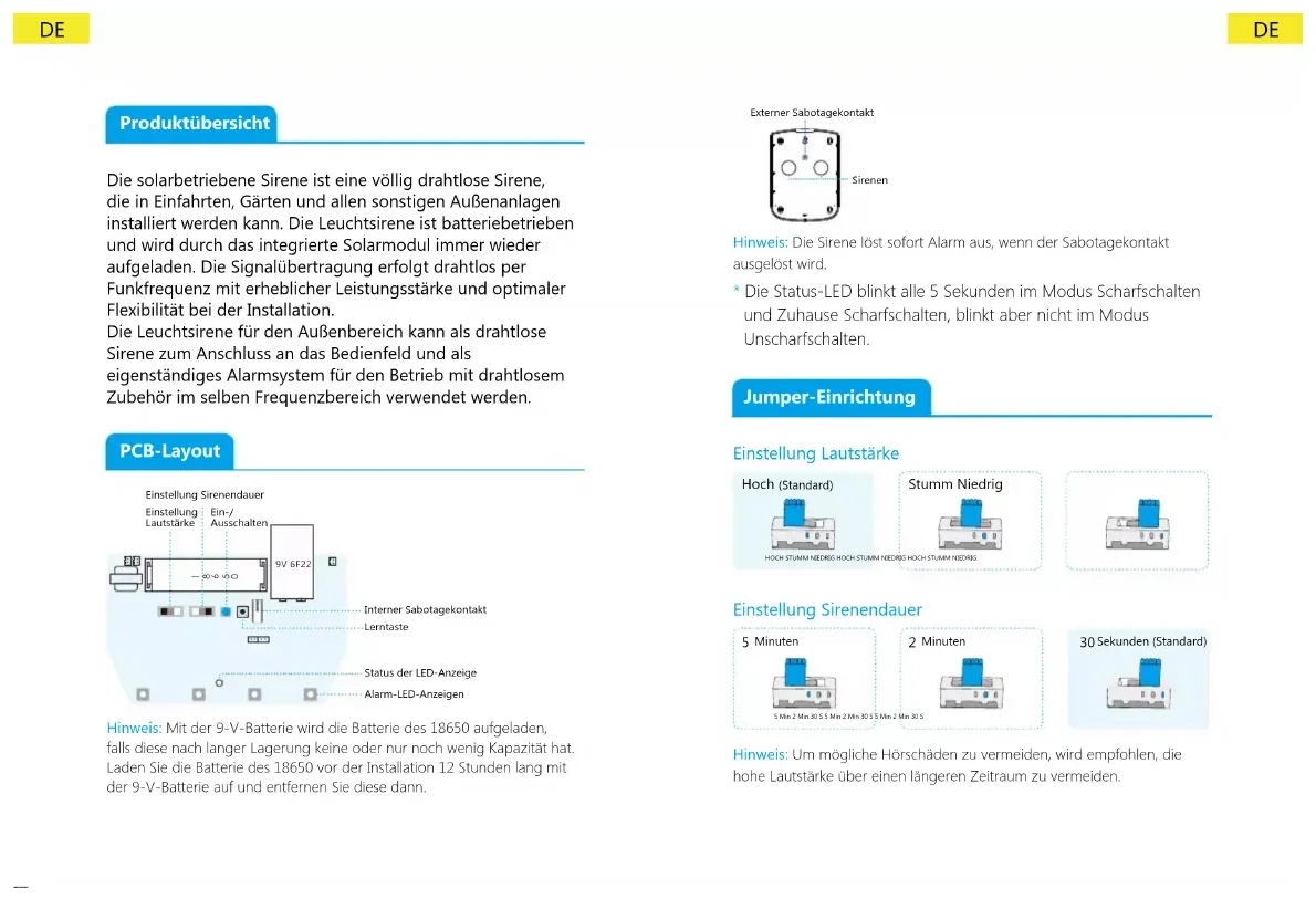 9V 6F22Interner SabotagekontaktEinstellung SirenendauerEinstellung LautstärkeEin-/AusschaltenLerntasteEinstellung Scharf-/Unscharf-Ton Einstellung Ein-und AusgangsverzögerungszeitStatus der LED-AnzeigeAlarm-LED-Anzeigen Hinweis: Mit der 9-V-Batterie wird die Batterie des 18650 aufgeladen, falls diese nach langer Lagerung keine oder nur noch wenig Kapazität hat. Laden Sie die Batterie des 18650 vor der Installation 12 Stunden lang mit der 9-V-Batterie auf und entfernen Sie diese dann. Externer SabotagekontaktSirenen Hinweis: Die Sirene löst sofort Alarm aus, wenn der Sabotagekontakt ausgelöst wird.