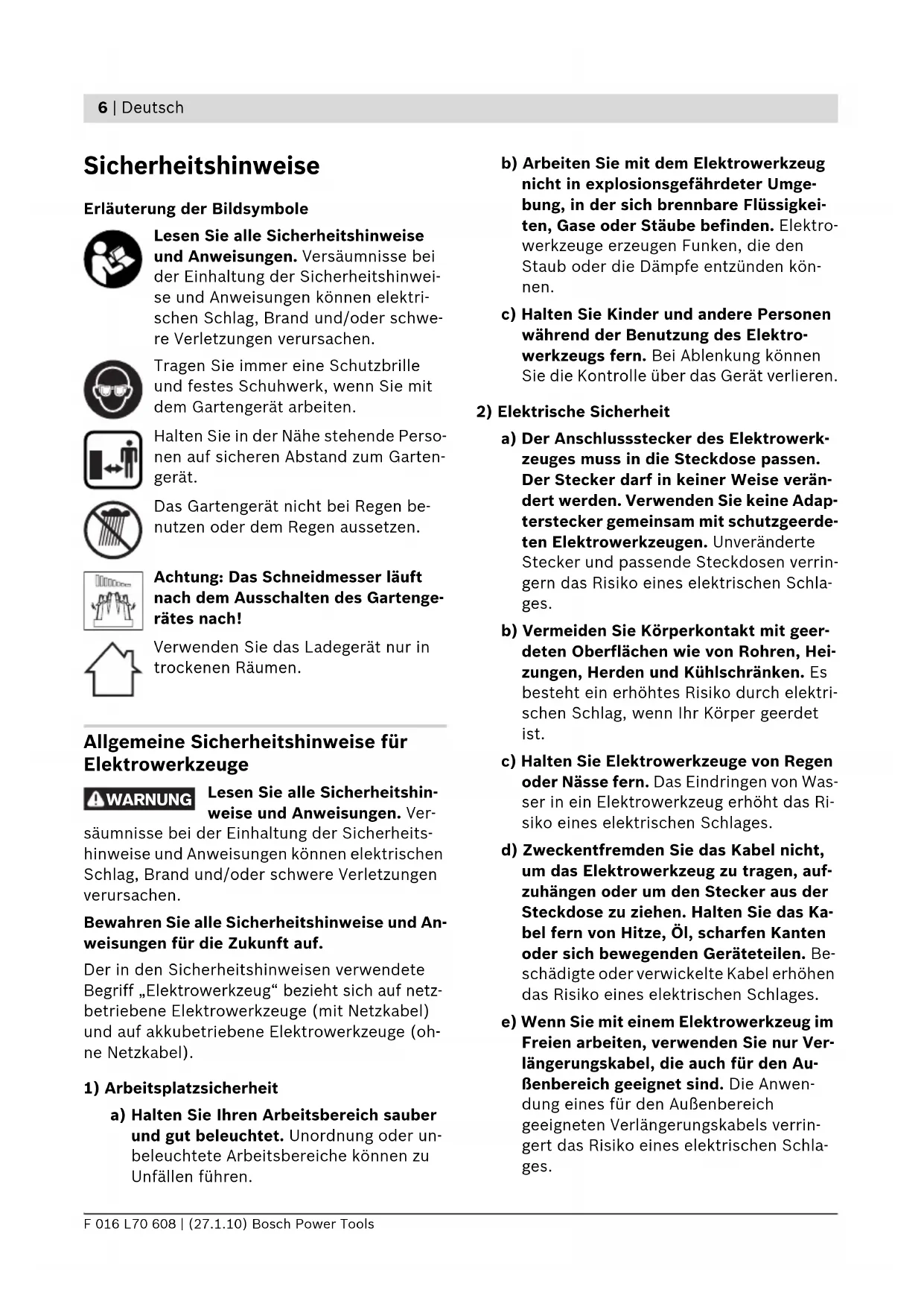 a) Lassen Sie Ihr Elektrowerkzeug nur von qualifiziertem Fachpersonal und nur mit Original-Ersatzteilen reparieren. Damit wird sichergestellt, dass die Sicherheit des Elektrowerkzeuges erhalten bleibt. Sicherheitshinweise für Heckenscheren f Halten Sie alle Körperteile vom Schneid- messer fern. Versuchen Sie nicht, bei lau- fendem Messer Schnittgut zu entfernen oder zu schneidendes Material festzuhal- ten. Entfernen Sie eingeklemmtes Schnitt- gut nur bei ausgeschaltetem Gerät. Ein Mo- ment der Unachtsamkeit bei Benutzung der Heckenschere kann zu schweren Verletzun- gen führen. f Tragen Sie die Heckenschere am Griff bei stillstehendem Messer. Bei Transport oder Aufbewahrung der Heckenschere stets die Schutzabdeckung aufziehen. Sorgfältiger Umgang mit dem Gerät verringert die Verlet- zungsgefahr durch das Messer. f Halten Sie das Elektrowerkzeug nur an den isolierten Griffflächen, da das Schneidmes- ser in Berührung mit verborgenen Stromlei- tungen kommen kann. Der Kontakt des Schneidmessers mit einer spannungsführen- den Leitung kann metallene Geräteteile un- ter Spannung setzen und zu einem elektri- schen Schlag führen. f Halten Sie das Kabel vom Schneidbereich fern. Während des Arbeitsvorgangs kann das Kabel im Gebüsch verdeckt sein und verse- hentlich durchtrennt werden. Sicherheitshinweise für Strauch-/Gras- scheren f Dieses Gartengerät ist nicht dafür bestimmt, von Personen (einschließlich Kinder) mit ein- geschränkten physischen, sensorischen oder geistigen Fähigkeiten oder mangelnder Er- fahrung und/oder mangelndem Wissen be- nutzt zu werden, es sei denn, sie werden durch eine für ihre Sicherheit zuständige Per- son beaufsichtigt oder erhalten von ihr An- weisungen, wie das Gartengerät zu benutzen ist. OBJ_BUCH-1077-002.book Page 8 Wednesday, January 27, 2010 4:40 PMDeutsch | 9 Bosch Power Tools F 016 L70 608 | (27.1.10) Kinder sollten beaufsichtigt werden, um si- cherzustellen, dass sie nicht mit dem Garten- gerät spielen. f Niemals Kindern oder mit diesen Anweisun- gen nicht vertrauten Personen erlauben das Gartengerät zu benutzen. Nationale Vor- schriften beschränken möglicherweise das Alter des Bedieners. Bewahren Sie das Gar- tengerät für Kinder unerreichbar auf, wenn es nicht in Gebrauch ist. f Der Bediener oder Nutzer ist für Unfälle oder Schäden an anderen Menschen oder deren Eigentum verantwortlich. f Betreiben Sie das Gartengerät niemals, wäh- rend sich Personen, insbesondere Kinder oder Haustiere, in unmittelbarer Nähe aufhal- ten. f Halten Sie das Anschlusskabel von den Schneidmessern fern. f Tragen Sie immer eine Schutzbrille und fes- tes Schuhwerk, wenn Sie mit dem Gartenge- rät arbeiten. f Trimmen Sie nicht bei schlechten Witte- rungsverhältnissen, insbesondere bei aufzie- henden Gewittern. f Verwenden Sie das Gartengerät nur bei Ta- geslicht oder gutem künstlichen Licht. f Prüfen Sie, ob Abdeckungen und Schutzvor- richtungen unbeschädigt und richtig ange- bracht sind. Führen Sie vor der Benutzung eventuell notwendige Wartungs- oder Repa- raturarbeiten durch. f Schalten Sie das Gartengerät erst ein, wenn Ihre Hände und Füße ausreichend weit von den Schneidmessern entfernt sind. f Trennen Sie das Gartengerät immer von der Stromversorgung (z.B. Netzstecker ziehen oder Einschaltsperre betätigen): – immer wenn Sie sich vom Gartengerät entfernen, – vor dem Beseitigen von Blockierungen, – wenn Sie das Gartengerät überprüfen, rei- nigen oder an ihm arbeiten, – nach der Kollision mit einem Fremdkör- per. Überprüfen Sie das Gartengerät so- fort auf Beschädigungen und lassen Sie es wenn notwendig instandsetzen, – wenn das Gartengerät ungewöhnlich zu vibrieren beginnt (sofort prüfen). f Schützen Sie sich vor Verletzungen von Fü- ßen und Händen durch die Schneidmesser. f Blockieren Sie vor allen Arbeiten am Elek- trowerkzeug (z.B. Wartung, Werkzeug- wechsel, etc.) sowie bei dessen Transport und Aufbewahrung den Ein-/Ausschalter in ausgeschalteter Position. Bei unbeabsich- tigtem Betätigen des Ein-/Ausschalters be- steht Verletzungsgefahr. Schützen Sie das Elektrowerkzeug vor Hitze, z. B. auch vor dauernder Sonneneinstrahlung, und Feuer. Es besteht Explosionsgefahr. f Öffnen Sie den Akku nicht. Es besteht die Gefahr eines Kurzschlusses. f Schließen Sie den Akku nicht kurz. Es be- steht Explosionsgefahr. f Bei Beschädigung und unsachgemäßem Ge- brauch des Akkus können Dämpfe austre- ten. Führen Sie Frischluft zu und suchen Sie bei Beschwerden einen Arzt auf. Die Dämp- fe können die Atemwege reizen. f Bei defektem Akku kann Flüssigkeit austre- ten und angrenzende Gegenstände benet- zen. Überprüfen Sie betroffene Teile. Reini- gen Sie diese oder tauschen Sie sie gegebenenfalls aus. Sicherheitshinweise für Ladegeräte Halten Sie das Ladegerät von Regen oder Nässe fern. Das Eindringen von Wasser in ein Ladegerät erhöht das Ri- siko eines elektrischen Schlages. f Laden Sie die Akkus nur in Ladegeräten auf, die vom Hersteller empfohlen werden. Für ein Ladegerät, das für eine bestimmte Art von Akkus geeignet ist, besteht Brandgefahr, wenn es mit anderen Akkus verwendet wird. OBJ_BUCH-1077-002.book Page 9 Wednesday, January 27, 2010 4:40 PM10 | Deutsch F 016 L70 608 | (27.1.10) Bosch Power Tools f Laden Sie keine Fremd-Akkus. Das Ladege- rät ist nur zum Laden von Bosch Li-Ionen-Ak- kus mit den in den Technischen Daten ange- gebenen Spannungen geeignet. Ansonsten besteht Brand- und Explosionsgefahr. f Laden Sie mit dem Ladegerät keine nicht wiederaufladbare Batterien. Es besteht Ex- plosionsgefahr. f Halten Sie das Ladegerät sauber. Durch Ver- schmutzung besteht die Gefahr eines elektri- schen Schlages. f Überprüfen Sie vor jeder Benutzung das La- degerät. Tauschen Sie das Ladegerät gegen ein Neues aus, sofern Sie Schäden feststel- len. Öffnen Sie das Ladegerät nicht selbst und lassen Sie es nur von qualifiziertem Fachpersonal und nur mit Original-Ersatz- teilen reparieren. Beschädi