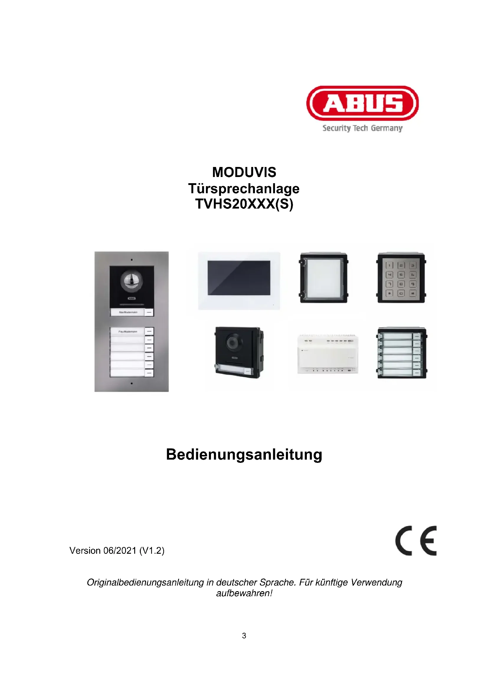 Diese MODUVIS Türsprechanlage stellt eine Gegensprechanlage mit Videodarstellung des Türbereiches dar. Die Anlage kann für Ein- und Mehrfamilienhäuser verwendet werden. Durch Erweiterungsmonitore in einer Wohneinheit kann die Anlage ebenfalls als Gegensprechanlage (ohne Video) innerhalb der Wohneinheit dienen. Die MODUVIS Türsprechanlage stellt keine Videoüberwachungsanlage dar und darf auch nicht als eine solche Anlage verwendet werden. Eine andere Verwendung als oben beschrieben kann zur Beschädigung des Produkts führen, außerdem bestehen weitere Gefahren. Jeder andere Einsatz ist nicht bestimmungsgemäß und führt zum Verlust der Garantie bzw. Gewährleistung; sämtliche Haftung wird ausgeschlossen. Dies gilt auch, wenn Umbauten und/oder Veränderungen am Produkt vorgenommen wurden. Lesen Sie sich die Bedienungsanleitung vollständig und aufmerksam durch, bevor Sie das Produkt in Betrieb nehmen. Die Bedienungsanleitung enthält wichtige Informationen für Montage und Bedienung.