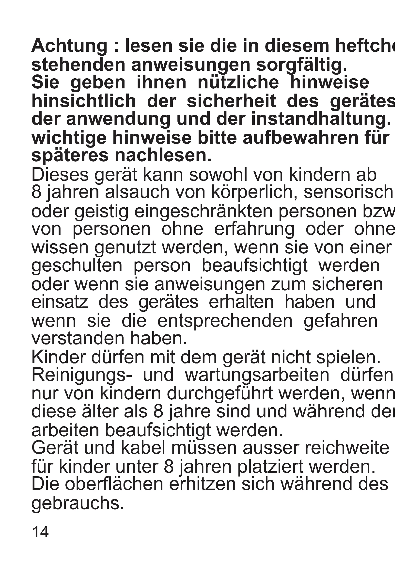 Entretien Cet appareil ne nécessite pas un entretien particulier. Débranchez l’appareil et laissez refroidir avant d’eectuer toute opération de nettoyage. Pour le nettoyage de l’appareil, utilisez un chion légèrement humide. N’utilisez pas de produits abrasifs ou de solvants chimiques. N’IMMERGEZ JAMAIS L’APPAREIL DANS L’EAU. Essuyez avec soin l’appareil avant de le ranger. Contrôlez périodiquement le câble: le contact avec la plaque pourrait provoquer des coupures ou des brûlures.Achtung : lesen sie die in diesem heftchen stehenden anweisungen sorgfältig. Sie geben ihnen nützliche hinweise hinsichtlich der sicherheit des gerätes, der anwendung und der instandhaltung. wichtige hinweise bitte aufbewahren für späteres nachlesen. Dieses gerät kann sowohl von kindern ab 8 jahren alsauch von körperlich, sensorisch oder geistig eingeschränkten personen bzw. von personen ohne erfahrung oder ohne wissen genutzt werden, wenn sie von einer geschulten person beaufsichtigt werden oder wenn sie anweisungen zum sicheren einsatz des gerätes erhalten haben und wenn sie die entsprechenden gefahren verstanden haben. Kinder dürfen mit dem gerät nicht spielen. Reinigungs- und wartungsarbeiten dürfen nur von kindern durchgeführt werden, wenn diese älter als 8 jahre sind und während der arbeiten beaufsichtigt werden. Gerät und kabel müssen ausser reichweite für kinder unter 8 jahren platziert werden. Die oberächen erhitzen sich während des gebrauchs. 14Anmerkungen