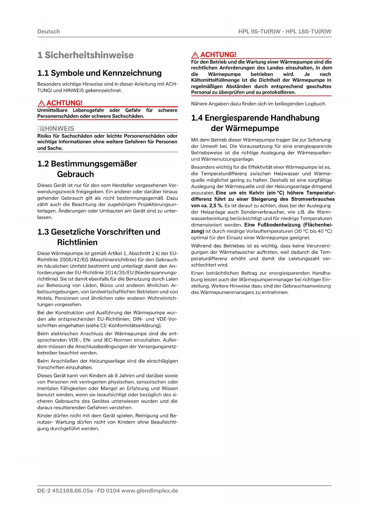 10.Beachten Sie, dass der Platzbedarf für Rohranschluß, Bedienung und Wartung größer ist. 11.siehe CE-Konformitätserklärung 12.Die Heizungsumwälzpumpe und Wärmepumpenmanager müssen immer betriebsbereit sein. 13.Steigerung der Leistungszahl unter Teillast bei Auswahl „energieoptimierter Heizbetrieb“ (natürliche Abtauung)www.glendimplex.de 452168.66.05a · FD 0104 DE-13 HPL 9S-TU(R)W - HPL 18S-TU(R)W Deutsch 1 Typ- und Verkaufsbezeichnung