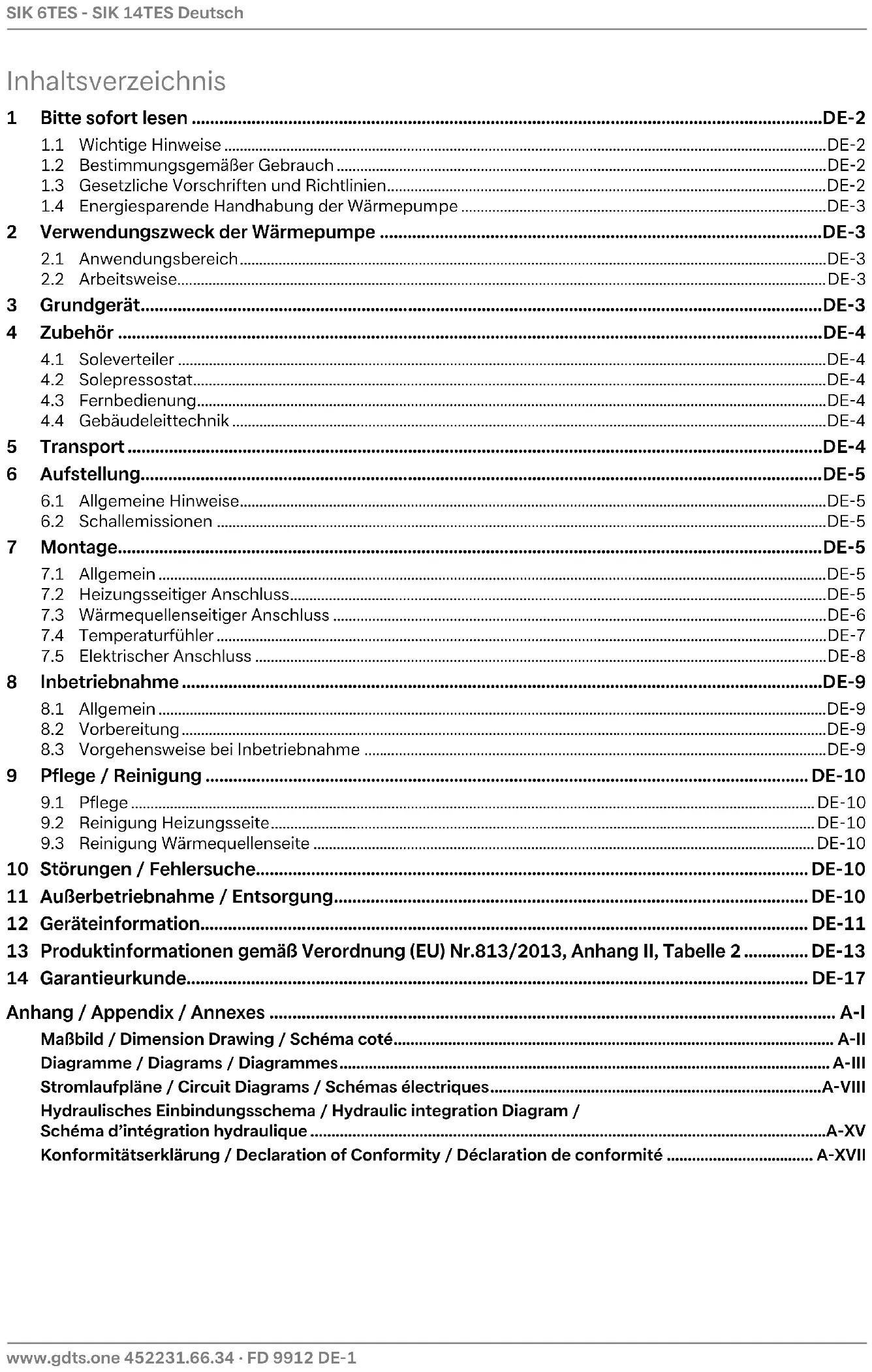 nein Modell Luft-Wasser-Wärmepumpe: nein Wasser-Wasser-Wärmepumpe: Niedertemperatur-Wärmepumpe: nein Mit Zusatzheizgerät: nein Kombiheizgerät mit Wärmepumpe: nein SIK 6TES Sole-Wasser-Wärmepumpe: jaDE-14 452231.66.34 · FD 9912 www.gdts.one Deutsch SIK 6TES - SIK 14TES Erforderliche Angaben über Raumheizgeräte und Kombiheizgeräte mit Wärmepumpe