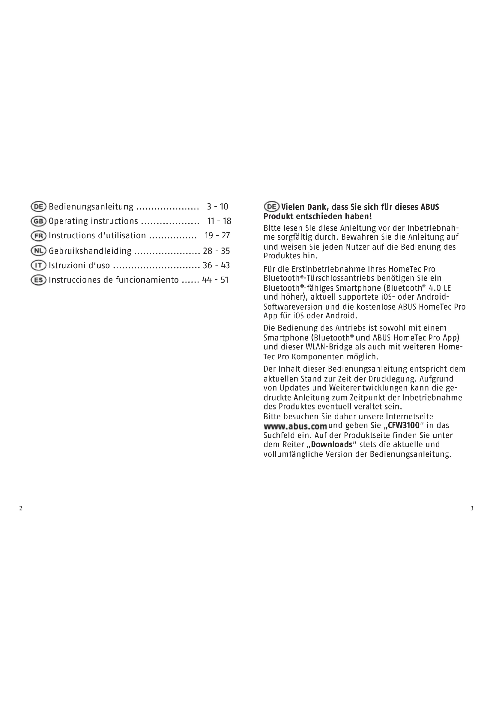 - - 43 Instrucciones de funcionamiento - 51 Vielen Dank, dass Sie sich für dieses ABUS Produkt entschieden haben! Bitte lesen Sie diese Anleitung vor der Inbetriebnah- me sorgfältig durch. Bewahren Sie die Anleitung auf und weisen Sie jeden Nutzer auf die Bedienung des Produktes hin. Für die Erstinbetriebnahme Ihres HomeTec Pro Bluetooth p. 44