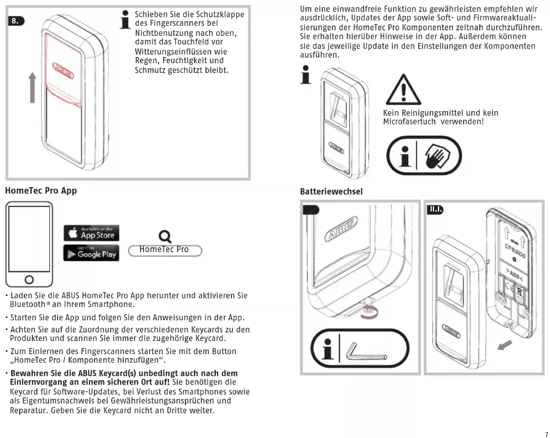 - Bewahren Sie die ABUS Keycard(s) unbedingt auch nach dem Einlernvorgang an einem sicheren Ort auf! Sie benötigen die Keycard für Soware-Updates, bei Verlust des Smartphones sowie als Eigentumsnachweis bei Gewährleistungsansprüchen und Reparatur. Geben Sie die Keycard nicht an Dritte weiter. HomeTec Pro Um eine einwandfreie Funktion zu gewährleisten empfehlen wir ausdrücklich, Updates der App sowie So- und Firmwareaktuali- sierungen der HomeTec Pro Komponenten zeitnah durchzuführen. Sie erhalten hierüber Hinweise in der App. Außerdem können sie das jeweilige Update in den Einstellungen der Komponenten ausführen. Kein Reinigungsmittel und kein Microfasertuch verwenden!