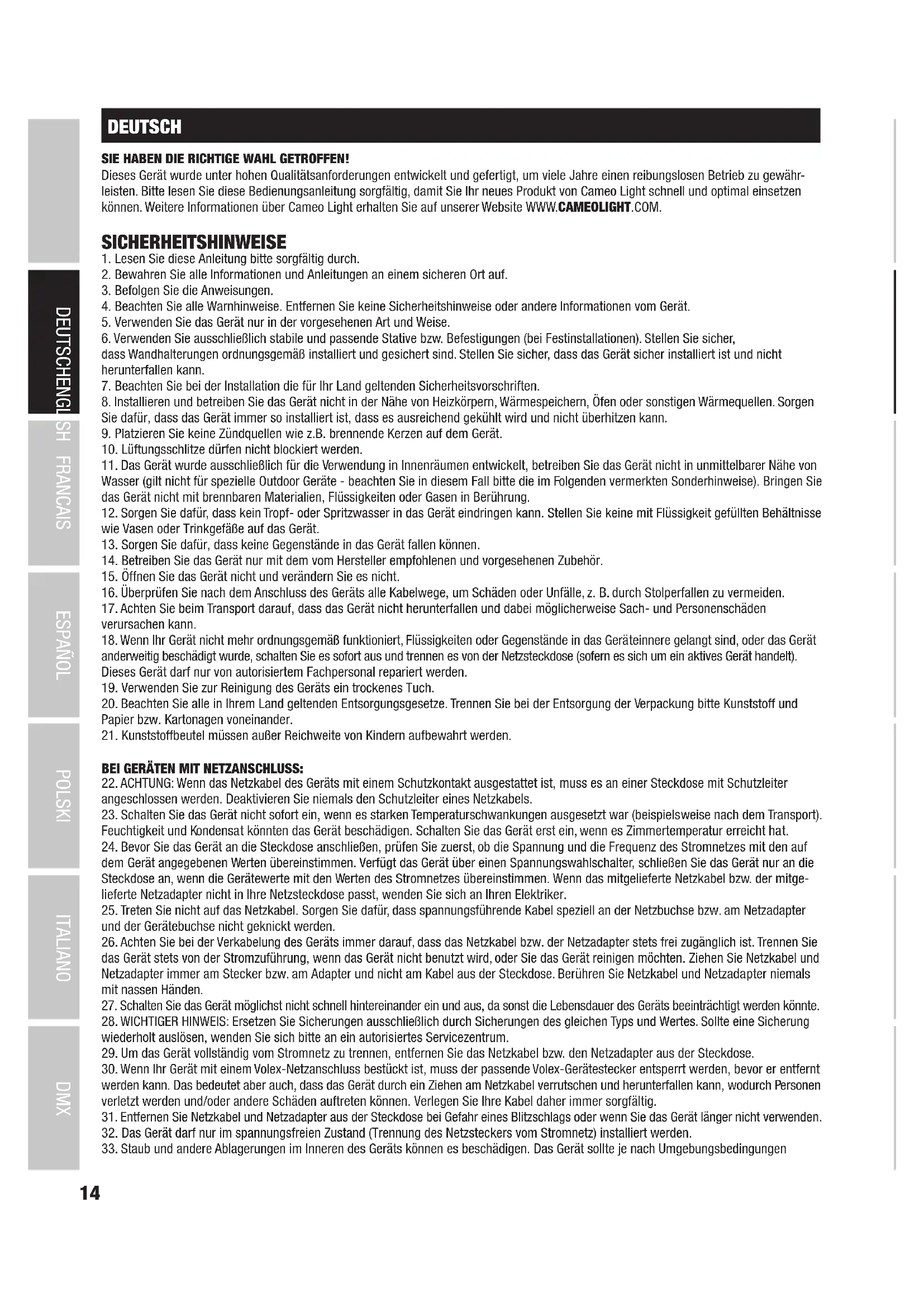 (Gültig in der Europäischen Union und anderen europäischen Ländern mit Mülltrennung) Dieses Symbol auf dem Produkt oder dazugehörigen Dokumenten weist darauf hin, dass das Gerät am Ende der Produktlebenszeit nicht zusammen mit dem normalen Hausmüll entsorgt werden darf, um Umwelt- oder Personenschäden durch unkontrollierte Abfallentsorgung zu vermeiden. Bitte entsorgen Sie dieses Produkt getrennt von anderen Abfällen und führen es zur Förderung nachhaltiger Wirtschaftskreisläufe dem Recycling zu. Als Privatkunde erhalten Sie Informationen zu umweltfreundlichen Entsorgungsmöglichkeiten über den Händler, bei dem das Produkt erworben wurde, oder über die entsprechenden regionalen Behörden. Als gewerblicher Nutzer kontaktieren Sie bitte Ihren Lieferanten und prüfen die ggf. vertraglich vereinbarten Konditionen zur Entsorgung der Geräte. Dieses Produkt darf nicht zusammen mit anderen gewerblichen Abfällen entsorgt werden. CE-Konformität Hiermit erklärt die Adam Hall GmbH, dass dieses Produkt folgenden Richtlinien entspricht (soweit zutreffend): R&TTE (1999/5/EG) bzw. RED (2014/53/EU) ab Juni 2017 Niederspannungsrichtlinie (2014/35/EU) EMV-Richtlinie (2014/30/EU) RoHS (2011/65/EU) Die vollständige Konformitätserklärung finden Sie unter www.adamhall.com. Des Weiteren können Sie diese auch unter info@adamhall.com anfragen.25 DMX DEUTSCHFRANCAIS ESPAÑOL ENGLISH ITALIANO POLSKI FRANCAIS Vous avez fait le bon choix! Cet appareil a été développé et fabriqué en appliquant des exigences de qualité très élevées: il garantit des années de fonctionnement sans problème.Veuillez lire attentivement ce Manuel Utilisateur : vous apprendrez rapidement à utiliser votre appareil Cameo Light de façon optimale. Vous trouverez davantage d‘informations à propos de Cameo Light sur notre site Web: WWW.CAMEOLIGHT.COM.