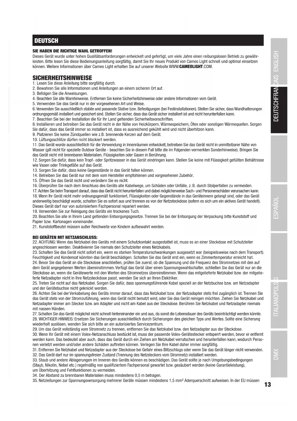 (Gültig in der Europäischen Union und anderen europäischen Ländern mit Mülltrennung) Dieses Symbol auf dem Produkt oder dazugehörigen Dokumenten weist darauf hin, dass das Gerät am Ende der Produktlebenszeit nicht zusammen mit dem normalen Hausmüll entsorgt werden darf, um Umwelt- oder Personenschäden durch unkontrollierte Abfallentsorgung zu vermeiden. Bitte entsorgen Sie dieses Produkt getrennt von anderen Abfällen und führen es zur Förderung nachhaltiger Wirtschaftskreisläufe dem Recycling zu. Als Privatkunde erhalten Sie Informationen zu umweltfreundlichen Entsorgungsmöglichkeiten über den Händler, bei dem das Produkt erworben wurde, oder über die entsprechenden regionalen Behörden. Als gewerblicher Nutzer kontaktieren Sie bitte Ihren Lieferanten und prüfen die ggf. vertraglich vereinbarten Konditionen zur Entsorgung der Geräte. Dieses Produkt darf nicht zusammen mit anderen gewerblichen Abfällen entsorgt werden. CE-Konformität Hiermit erklärt die Adam Hall GmbH, dass dieses Produkt folgenden Richtlinien entspricht (soweit zutreffend): R&TTE (1999/5/EG) bzw. RED (2014/53/EU) ab Juni 2017 Niederspannungsrichtlinie (2014/35/EU) EMV-Richtlinie (2014/30/EU) RoHS (2011/65/EU) Die vollständige Konformitätserklärung finden Sie unter www.adamhall.com. Des Weiteren können Sie diese auch unter info@adamhall.com anfragen.23 DMX DEUTSCHFRANCAIS ESPAÑOL ENGLISH ITALIANO POLSKI FRANCAIS Vous avez fait le bon choix! Cet appareil a été développé et fabriqué en appliquant des exigences de qualité très élevées: il garantit des années de fonctionnement sans problème.Veuillez lire attentivement ce Manuel Utilisateur : vous apprendrez rapidement à utiliser votre appareil Cameo Light de façon optimale. Vous trouverez davantage d‘informations à propos de Cameo Light sur notre site Web: WWW.CAMEOLIGHT.COM.