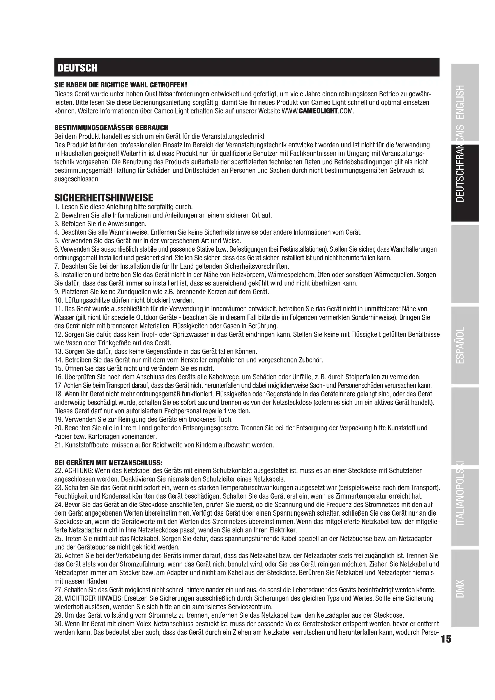 BEI GERÄTEN MIT NETZANSCHLUSS: 22. ACHTUNG: Wenn das Netzkabel des Geräts mit einem Schutzkontakt ausgestattet ist, muss es an einer Steckdose mit Schutzleiter angeschlossen werden. Deaktivieren Sie niemals den Schutzleiter eines Netzkabels. 23. Schalten Sie das Gerät nicht sofort ein, wenn es starken Temperaturschwankungen ausgesetzt war (beispielsweise nach dem Transport). Feuchtigkeit und Kondensat könnten das Gerät beschädigen. Schalten Sie das Gerät erst ein, wenn es Zimmertemperatur erreicht hat. 24. Bevor Sie das Gerät an die Steckdose anschließen, prüfen Sie zuerst, ob die Spannung und die Frequenz des Stromnetzes mit den auf dem Gerät angegebenen Werten übereinstimmen. Verfügt das Gerät über einen Spannungswahlschalter, schließen Sie das Gerät nur an die Steckdose an, wenn die Gerätewerte mit den Werten des Stromnetzes übereinstimmen. Wenn das mitgelieferte Netzkabel bzw. der mitgelie- ferte Netzadapter nicht in Ihre Netzsteckdose passt, wenden Sie sich an Ihren Elektriker. 25. Treten Sie nicht auf das Netzkabel. Sorgen Sie dafür, dass spannungsführende Kabel speziell an der Netzbuchse bzw. am Netzadapter und der Gerätebuchse nicht geknickt werden. 26. Achten Sie bei der Verkabelung des Geräts immer darauf, dass das Netzkabel bzw. der Netzadapter stets frei zugänglich ist. Trennen Sie das Gerät stets von der Stromzuführung, wenn das Gerät nicht benutzt wird, oder Sie das Gerät reinigen möchten. Ziehen Sie Netzkabel und Netzadapter immer am Stecker bzw. am Adapter und nicht am Kabel aus der Steckdose. Berühren Sie Netzkabel und Netzadapter niemals mit nassen Händen. 27. Schalten Sie das Gerät möglichst nicht schnell hintereinander ein und aus, da sonst die Lebensdauer des Geräts beeinträchtigt werden könnte. 28. WICHTIGER HINWEIS: Ersetzen Sie Sicherungen ausschließlich durch Sicherungen des gleichen Typs und Wertes. Sollte eine Sicherung wiederholt auslösen, wenden Sie sich bitte an ein autorisiertes Servicezentrum. 29. Um das Gerät vollständig vom Stromnetz zu trennen, entfernen Sie das Netzkabel bzw. den Netzadapter aus der Steckdose. 30. Wenn Ihr Gerät mit einem Volex-Netzanschluss bestückt ist, muss der passende Volex-Gerätestecker entsperrt werden, bevor er entfernt werden kann. Das bedeutet aber auch, dass das Gerät durch ein Ziehen am Netzkabel verrutschen und herunterfallen kann, wodurch Perso-16 DMX ITALIANO POLSKI ESPAÑOL FRANCAIS DEUTSCHENGLISH nen verletzt werden und/oder andere Schäden auftreten können. Verlegen Sie Ihre Kabel daher immer sorgfältig. 31. Entfernen Sie Netzkabel und Netzadapter aus der Steckdose bei Gefahr eines Blitzschlags oder wenn Sie das Gerät länger nicht verwenden.