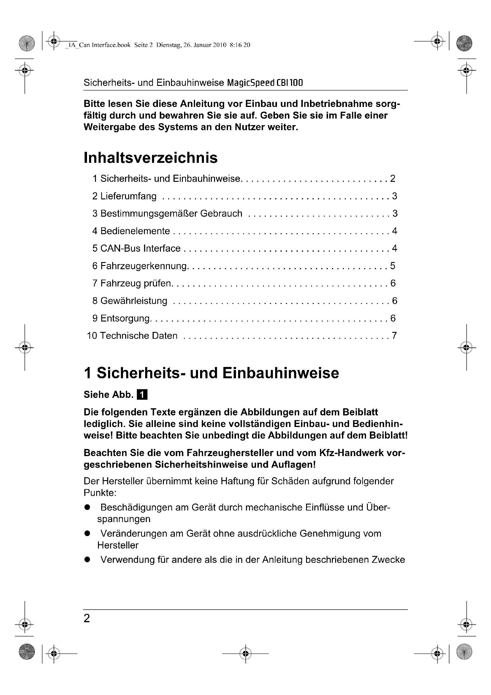 - 10 Technische Daten 1 Sicherheits- und Einbauhinweise Siehe Abb. 1 Die folgenden Texte ergänzen die Abbildungen auf dem Beiblatt lediglich. Sie alleine sind keine vollständigen Einbau- und Bedienhin- weise! Bitte beachten Sie unbedingt die Abbildungen auf dem Beiblatt! Beachten Sie die vom Fahrzeughersteller und vom Kfz-Handwerk vor- geschriebenen Sicherheitshinweise und Auflagen! Der Hersteller übernimmt keine Haftung für Schäden aufgrund folgender Punkte: z Beschädigungen am Gerät durch mechanische Einflüsse und Über- spannungen z Veränderungen am Gerät ohne ausdrückliche Genehmigung vom Hersteller z Verwendung für andere als die in der Anleitung beschriebenen Zwecke _IA_Can Interface.book Seite 2 Dienstag, 26. Januar 2010 8:16 20MagicSpeed CBI 100 Lieferumfang p. 7