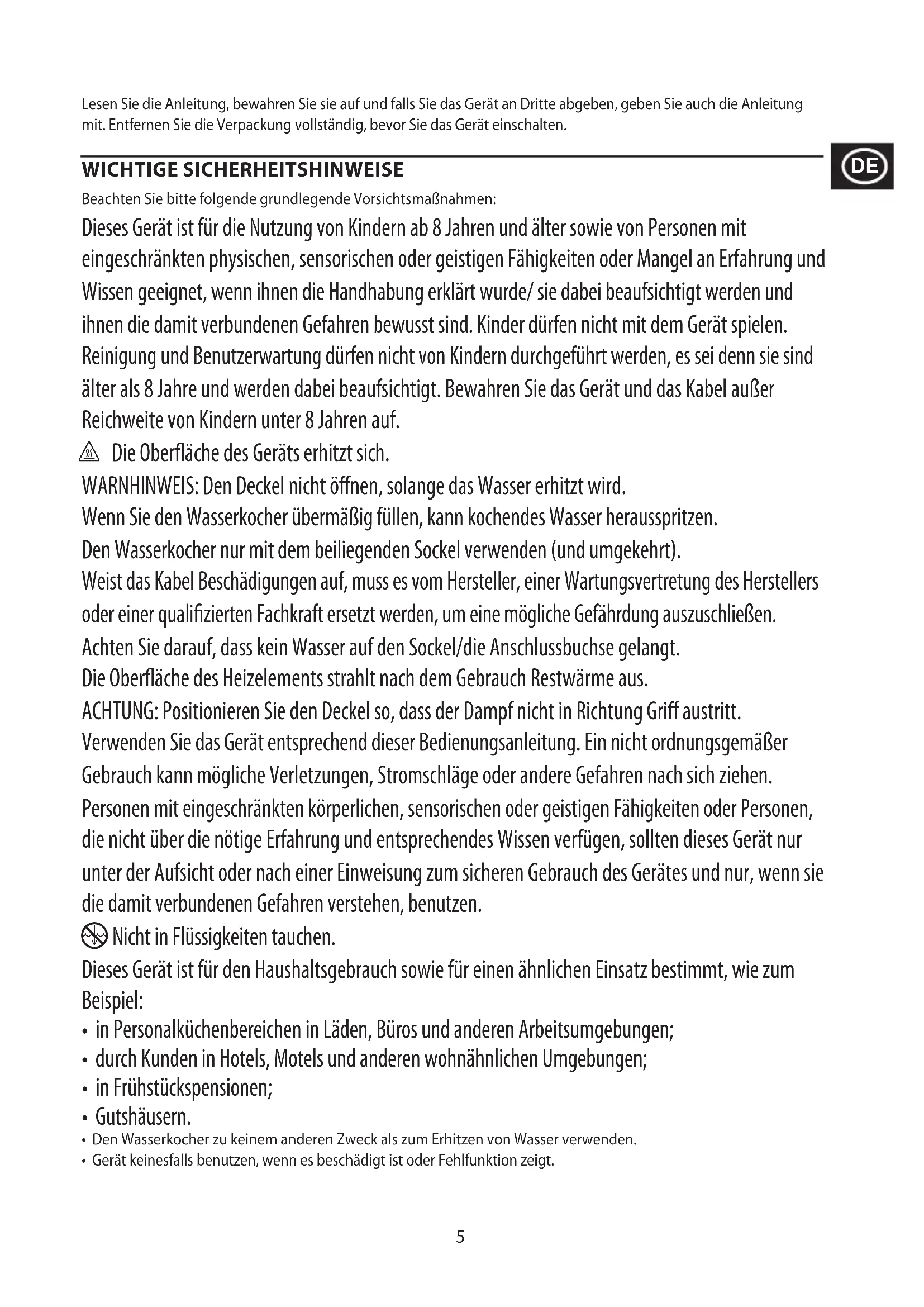 To avoid environmental and health problems due to hazardous substances, appliances and rechargeable and non-rechargeable batteries marked with one of these symbols must not be disposed of with unsorted municipal waste. Always dispose of electrical and electronic products and, where applicable, rechargeable and non-rechargeable batteries, at an appropriate official recycling/collection point.5 Lesen Sie die Anleitung, bewahren Sie sie auf und falls Sie das Gerät an Dritte abgeben, geben Sie auch die Anleitung mit. Entfernen Sie die Verpackung vollständig, bevor Sie das Gerät einschalten. WICHTIGE SICHERHEITSHINWEISE Beachten Sie bitte folgende grundlegende Vorsichtsmaßnahmen: Dieses Gerät ist für die Nutzung von Kindern ab 8 Jahren und älter sowie von Personen mit eingeschränkten physischen, sensorischen oder geistigen Fähigkeiten oder Mangel an Erfahrung und Wissen geeignet, wenn ihnen die Handhabung erklärt wurde/ sie dabei beaufsichtigt werden und ihnen die damit verbundenen Gefahren bewusst sind. Kinder dürfen nicht mit dem Gerät spielen. Reinigung und Benutzerwartung dürfen nicht von Kindern durchgeführt werden, es sei denn sie sind älter als 8 Jahre und werden dabei beaufsichtigt. Bewahren Sie das Gerät und das Kabel außer Reichweite von Kindern unter 8 Jahren auf. h Die Oberfläche des Geräts erhitzt sich. WARNHINWEIS: Den Deckel nicht öffnen, solange das Wasser erhitzt wird. Wenn Sie den Wasserkocher übermäßig füllen, kann kochendes Wasser herausspritzen. Den Wasserkocher nur mit dem beiliegenden Sockel verwenden (und umgekehrt). Weist das Kabel Beschädigungen auf, muss es vom Hersteller, einer Wartungsvertretung des Herstellers oder einer qualifizierten Fachkraft ersetzt werden, um eine mögliche Gefährdung auszuschließen. Achten Sie darauf, dass kein Wasser auf den Sockel/die Anschlussbuchse gelangt. Die Oberfläche des Heizelements strahlt nach dem Gebrauch Restwärme aus. ACHTUNG: Positionieren Sie den Deckel so, dass der Dampf nicht in Richtung Griff austritt. Verwenden Sie das Gerät entsprechend dieser Bedienungsanleitung. Ein nicht ordnungsgemäßer Gebrauch kann mögliche Verletzungen, Stromschläge oder andere Gefahren nach sich ziehen. Personen mit eingeschränkten körperlichen, sensorischen oder geistigen Fähigkeiten oder Personen, die nicht über die nötige Erfahrung und entsprechendes Wissen verfügen, sollten dieses Gerät nur unter der Aufsicht oder nach einer Einweisung zum sicheren Gebrauch des Gerätes und nur, wenn sie die damit verbundenen Gefahren verstehen, benutzen.