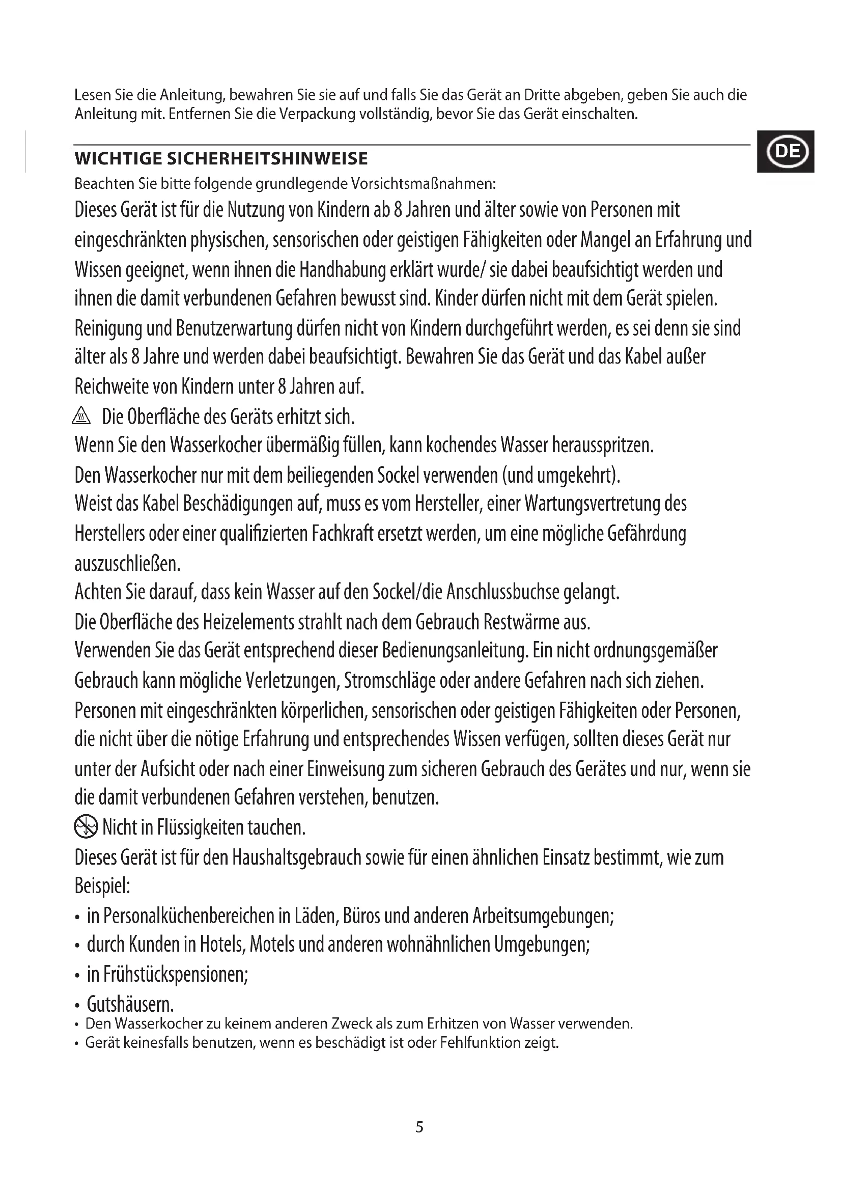 To avoid environmental and health problems due to hazardous substances, appliances and rechargeable and non-rechargeable batteries marked with one of these symbols must not be disposed of with unsorted municipal waste. Always dispose of electrical and electronic products and, where applicable, rechargeable and non-rechargeable batteries, at an appropriate official recycling/collection point.5 Lesen Sie die Anleitung, bewahren Sie sie auf und falls Sie das Gerät an Dritte abgeben, geben Sie auch die Anleitung mit. Entfernen Sie die Verpackung vollständig, bevor Sie das Gerät einschalten. WICHTIGE SICHERHEITSHINWEISE Beachten Sie bitte folgende grundlegende Vorsichtsmaßnahmen: Dieses Gerät ist für die Nutzung von Kindern ab 8 Jahren und älter sowie von Personen mit eingeschränkten physischen, sensorischen oder geistigen Fähigkeiten oder Mangel an Erfahrung und Wissen geeignet, wenn ihnen die Handhabung erklärt wurde/ sie dabei beaufsichtigt werden und ihnen die damit verbundenen Gefahren bewusst sind. Kinder dürfen nicht mit dem Gerät spielen. Reinigung und Benutzerwartung dürfen nicht von Kindern durchgeführt werden, es sei denn sie sind älter als 8 Jahre und werden dabei beaufsichtigt. Bewahren Sie das Gerät und das Kabel außer Reichweite von Kindern unter 8 Jahren auf. h Die Oberfläche des Geräts erhitzt sich. Wenn Sie den Wasserkocher übermäßig füllen, kann kochendes Wasser herausspritzen. Den Wasserkocher nur mit dem beiliegenden Sockel verwenden (und umgekehrt). Weist das Kabel Beschädigungen auf, muss es vom Hersteller, einer Wartungsvertretung des Herstellers oder einer qualifizierten Fachkraft ersetzt werden, um eine mögliche Gefährdung auszuschließen. Achten Sie darauf, dass kein Wasser auf den Sockel/die Anschlussbuchse gelangt. Die Oberfläche des Heizelements strahlt nach dem Gebrauch Restwärme aus. Verwenden Sie das Gerät entsprechend dieser Bedienungsanleitung. Ein nicht ordnungsgemäßer Gebrauch kann mögliche Verletzungen, Stromschläge oder andere Gefahren nach sich ziehen. Personen mit eingeschränkten körperlichen, sensorischen oder geistigen Fähigkeiten oder Personen, die nicht über die nötige Erfahrung und entsprechendes Wissen verfügen, sollten dieses Gerät nur unter der Aufsicht oder nach einer Einweisung zum sicheren Gebrauch des Gerätes und nur, wenn sie die damit verbundenen Gefahren verstehen, benutzen.