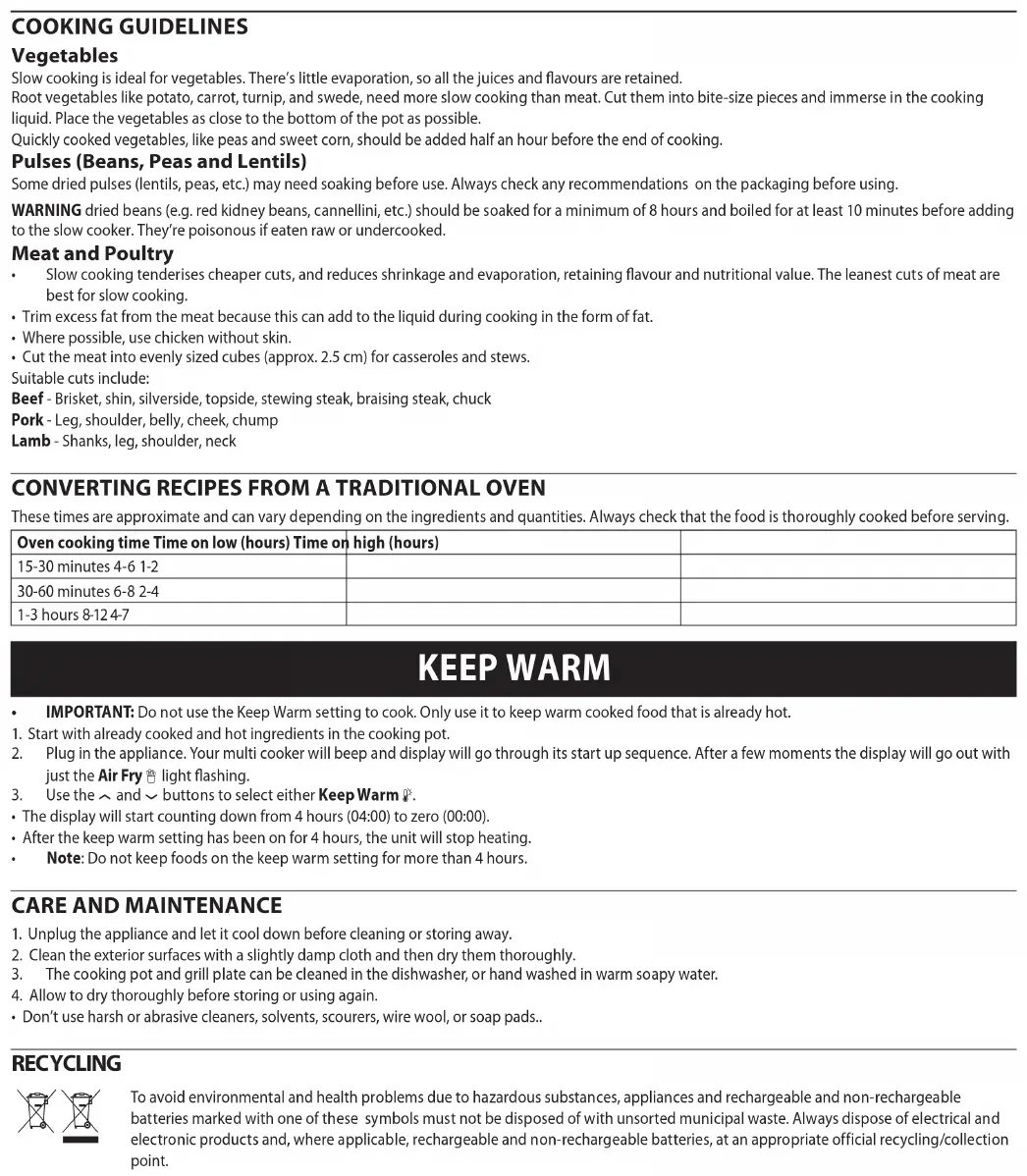 UA14 min vor Ablauf der Zubereitungszeit zum Gericht hinzu. Alternativ können Sie fertigen Soßenbinder nach Angaben des Herstellers unterrühren. ZUBEREITUNGSEMPFEHLUNGEN Gemüse Wurzelgemüse wie Kartoffeln, Möhren, Speise- und Steckrüben müssen länger im Schongarverfahren zubereitet werden als Fleisch. Schneiden Sie es in mundgerechte Stücke und bedecken Sie diese mit der Garflüssigkeit. Legen Sie das Gemüse so dicht wie möglich auf den Boden des Topfes. Gemüse, das nur eine kurze Garzeit benötigt, wie Erbsen und Mais, sollte eine halbe Stunde vor Ablauf der Zubereitungszeit hinzugegeben werden. Hülsenfrüchte (Bohnen, Erbsen und Linsen) Einige Hülsenfrüchte (Linsen, Erbsen usw.) müssen vor der Zubereitung möglicherweise noch in Wasser eingeweicht werden. Achten Sie vor der Zubereitung stets auf die Empfehlungen auf der Verpackung. WARNUNG Trockenbohnen (z.B. Rote Kidneybohnen, Cannellini-Bohnen usw.) sollten mindestens 8 Stunden lang eingeweicht und mindestens 10 min vorgekocht werden, bevor Sie sie in den Schongarer geben. Werden sie roh oder halbgar verzehrt, sind sie giftig. Fleisch und Geflügel