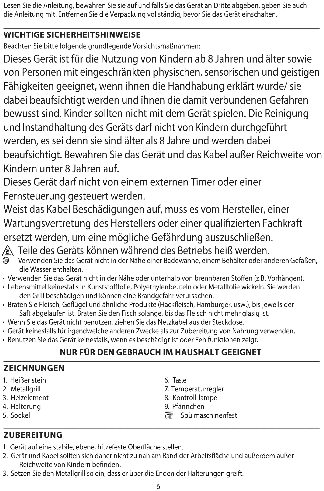 AE6 Lesen Sie die Anleitung, bewahren Sie sie auf und falls Sie das Gerät an Dritte abgeben, geben Sie auch die Anleitung mit. Entfernen Sie die Verpackung vollständig, bevor Sie das Gerät einschalten. WICHTIGE SICHERHEITSHINWEISE Beachten Sie bitte folgende grundlegende Vorsichtsmaßnahmen: Dieses Gerät ist für die Nutzung von Kindern ab 8 Jahren und älter sowie von Personen mit eingeschränkten physischen, sensorischen und geistigen Fähigkeiten geeignet, wenn ihnen die Handhabung erklärt wurde/ sie dabei beaufsichtigt werden und ihnen die damit verbundenen Gefahren bewusst sind. Kinder sollten nicht mit dem Gerät spielen. Die Reinigung und Instandhaltung des Geräts darf nicht von Kindern durchgeführt werden, es sei denn sie sind älter als 8 Jahre und werden dabei beaufsichtigt. Bewahren Sie das Gerät und das Kabel außer Reichweite von Kindern unter 8 Jahren auf. Dieses Gerät darf nicht von einem externen Timer oder einer Fernsteuerung gesteuert werden. Weist das Kabel Beschädigungen auf, muss es vom Hersteller, einer Wartungsvertretung des Herstellers oder einer qualifizierten Fachkraft ersetzt werden, um eine mögliche Gefährdung auszuschließen.