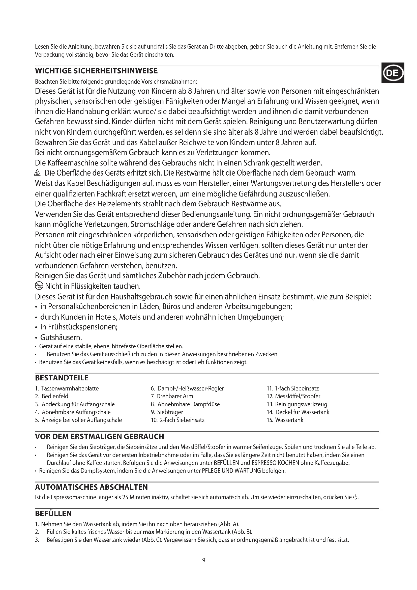 To avoid environmental and health problems due to hazardous substances, appliances and rechargeable and non- rechargeable batteries marked with one of these symbols must not be disposed of with unsorted municipal waste. Always dispose of electrical and electronic products and, where applicable, rechargeable and non-rechargeable batteries, at an appropriate official recycling/collection point.9 Lesen Sie die Anleitung, bewahren Sie sie auf und falls Sie das Gerät an Dritte abgeben, geben Sie auch die Anleitung mit. Entfernen Sie die Verpackung vollständig, bevor Sie das Gerät einschalten. WICHTIGE SICHERHEITSHINWEISE Beachten Sie bitte folgende grundlegende Vorsichtsmaßnahmen: Dieses Gerät ist für die Nutzung von Kindern ab 8 Jahren und älter sowie von Personen mit eingeschränkten physischen, sensorischen oder geistigen Fähigkeiten oder Mangel an Erfahrung und Wissen geeignet, wenn ihnen die Handhabung erklärt wurde/ sie dabei beaufsichtigt werden und ihnen die damit verbundenen Gefahren bewusst sind. Kinder dürfen nicht mit dem Gerät spielen. Reinigung und Benutzerwartung dürfen nicht von Kindern durchgeführt werden, es sei denn sie sind älter als 8 Jahre und werden dabei beaufsichtigt. Bewahren Sie das Gerät und das Kabel außer Reichweite von Kindern unter 8 Jahren auf. Bei nicht ordnungsgemäßem Gebrauch kann es zu Verletzungen kommen. Die Kaffeemaschine sollte während des Gebrauchs nicht in einen Schrank gestellt werden. h Die Oberfläche des Geräts erhitzt sich. Die Restwärme hält die Oberfläche nach dem Gebrauch warm. Weist das Kabel Beschädigungen auf, muss es vom Hersteller, einer Wartungsvertretung des Herstellers oder einer qualifizierten Fachkraft ersetzt werden, um eine mögliche Gefährdung auszuschließen. Die Oberfläche des Heizelements strahlt nach dem Gebrauch Restwärme aus. Verwenden Sie das Gerät entsprechend dieser Bedienungsanleitung. Ein nicht ordnungsgemäßer Gebrauch kann mögliche Verletzungen, Stromschläge oder andere Gefahren nach sich ziehen. Personen mit eingeschränkten körperlichen, sensorischen oder geistigen Fähigkeiten oder Personen, die nicht über die nötige Erfahrung und entsprechendes Wissen verfügen, sollten dieses Gerät nur unter der Aufsicht oder nach einer Einweisung zum sicheren Gebrauch des Gerätes und nur, wenn sie die damit verbundenen Gefahren verstehen, benutzen. Reinigen Sie das Gerät und sämtliches Zubehör nach jedem Gebrauch.