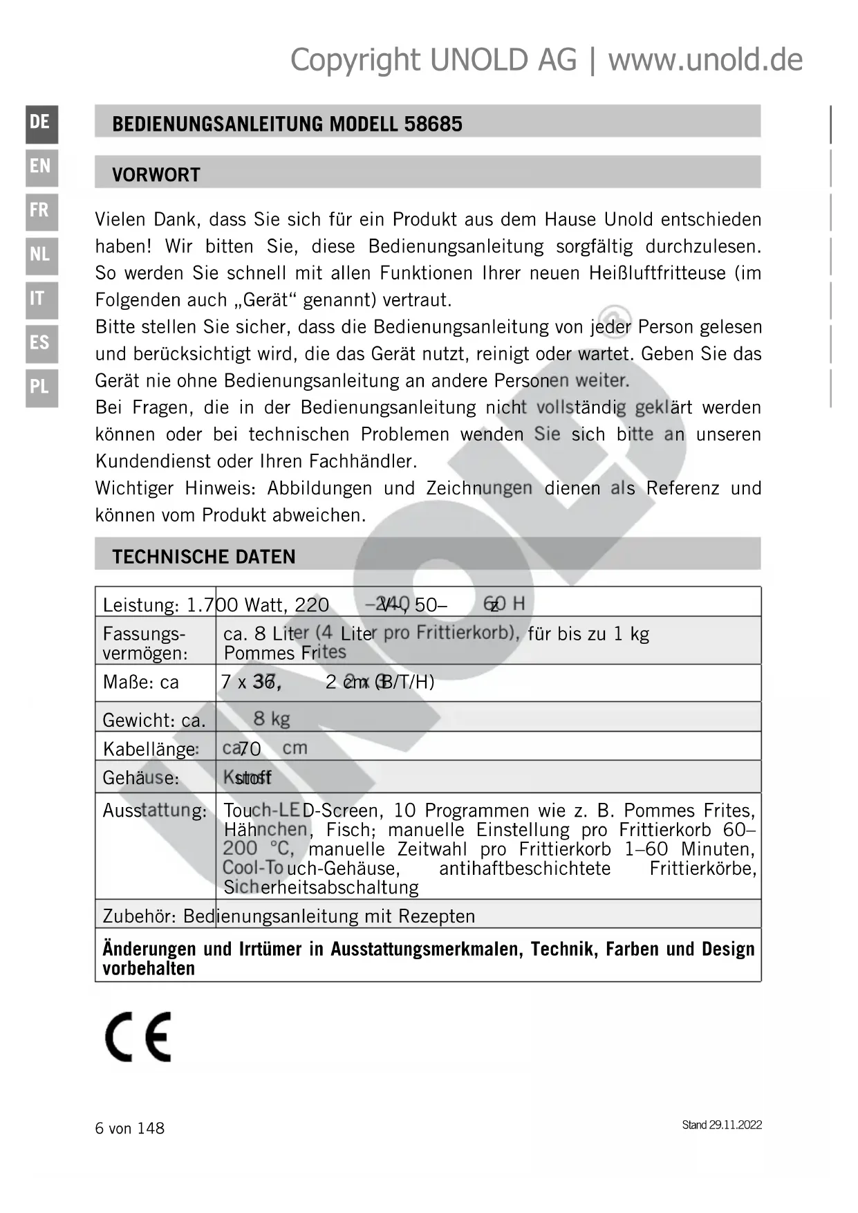 BEDIENUNGSANLEITUNG MODELL 58685 VORWORT Vielen Dank, dass Sie sich für ein Produkt aus dem Hause Unold entschieden haben! Wir bitten Sie, diese Bedienungsanleitung sorgfältig durchzulesen. So werden Sie schnell mit allen Funktionen Ihrer neuen Heißluftfritteuse (im Folgenden auch „Gerät“ genannt) vertraut. Bitte stellen Sie sicher, dass die Bedienungsanleitung von jeder Person gelesen und berücksichtigt wird, die das Gerät nutzt, reinigt oder wartet. Geben Sie das Gerät nie ohne Bedienungsanleitung an andere Personen weiter. Bei Fragen, die in der Bedienungsanleitung nicht vollständig geklärt werden können oder bei technischen Problemen wenden Sie sich bitte an unseren Kundendienst oder Ihren Fachhändler. Wichtiger Hinweis: Abbildungen und Zeichnungen dienen als Referenz und können vom Produkt abweichen. TECHNISCHE DATEN Leistung: 1.700 Watt, 220–240 V~, 50–60 Hz Fassungs- vermögen: ca. 8 Liter (4 Liter pro Frittierkorb), für bis zu 1 kg Pommes Frites Maße: ca. 37,7 x 36,2 x 32 cm (B/T/H) Gewicht: ca. 8 kg Kabellänge: ca. 70 cm Gehäuse: Kunststoff Ausstattung: Touch-LED-Screen, 10 Programmen wie z. B. Pommes Frites, Hähnchen, Fisch; manuelle Einstellung pro Frittierkorb 60– 200 °C, manuelle Zeitwahl pro Frittierkorb 1–60 Minuten, Cool-Touch-Gehäuse, antihaftbeschichtete Frittierkörbe, Sicherheitsabschaltung Zubehör: Bedienungsanleitung mit Rezepten Änderungen und Irrtümer in Ausstattungsmerkmalen, Technik, Farben und Design vorbehalten Copyright UNOLD AG | www.unold.deStand 29.11.2022 7 von 148