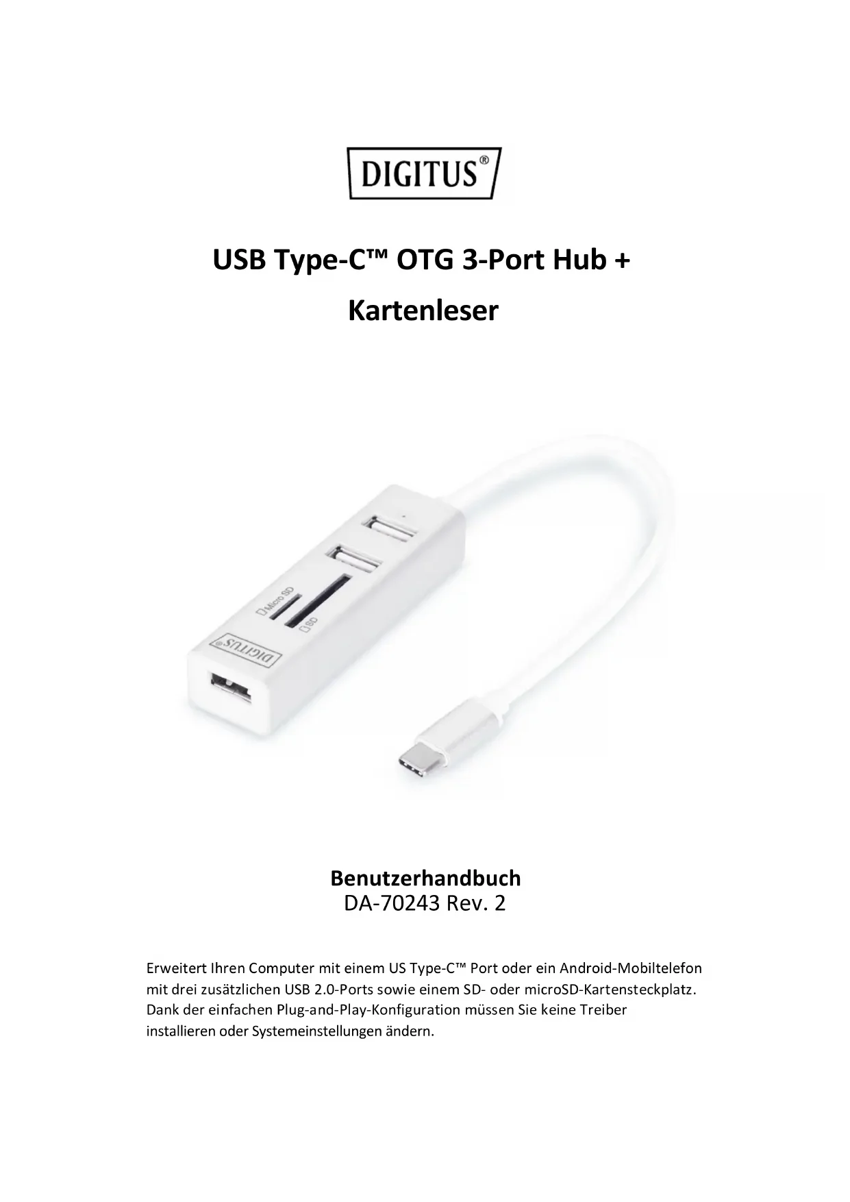 Hiermit erklärt die Assmann Electronic GmbH, dass die gedruckte Konformitätserklärung dem Produkt beiliegt. Sollte die Konformitätserklärung fehlen, kann diese postalisch unter der unten genannten Herstelleradresse angefordert werden. www.assmann.com Assmann Electronic GmbH Auf dem Schüffel 3 58513 Lüdenscheid GermanyUSB Type-C™ OTG 3-Port HUB + Card Reader